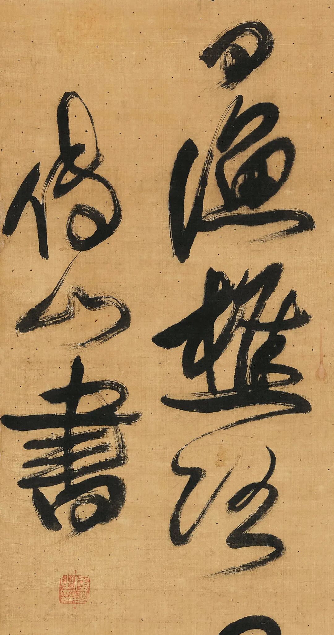 尽管张瑞图自谓“余于草书,亦少知使转而已,情性终不近也”,此作因书写此种巨幅大字,不如写小字挥洒自如,所以后人所评其书“有折无转”,转换为更多的“折转互用”。我们说,书家不可能以单一的笔法进行创作,“有折无转”亦是张瑞图典型书风之概括,即使在张瑞图形成其个人风格比较强烈的天启年间(1621-1627),许多作品都体现出折转兼备的特点,如其于天启七年创作的《杜甫饮中八仙歌试卷》,其标准的“三角形”的折角已经不多见,横折的角度大多在90°左右,方圆互用,折转自如。类似还如藏于故宫博物院的《行草欧阳修醉翁亭记卷》;江西省博物馆所藏的《行书五律诗》等等,都体现了一种书法家的自信和变化。另外,本作书写字体之大,张瑞图在处理字与字之映带关系如牵丝的连带与呼应亦缓急相间,如“积金”“遗子孙”“中以 为”“子孙长久”等等。![]()