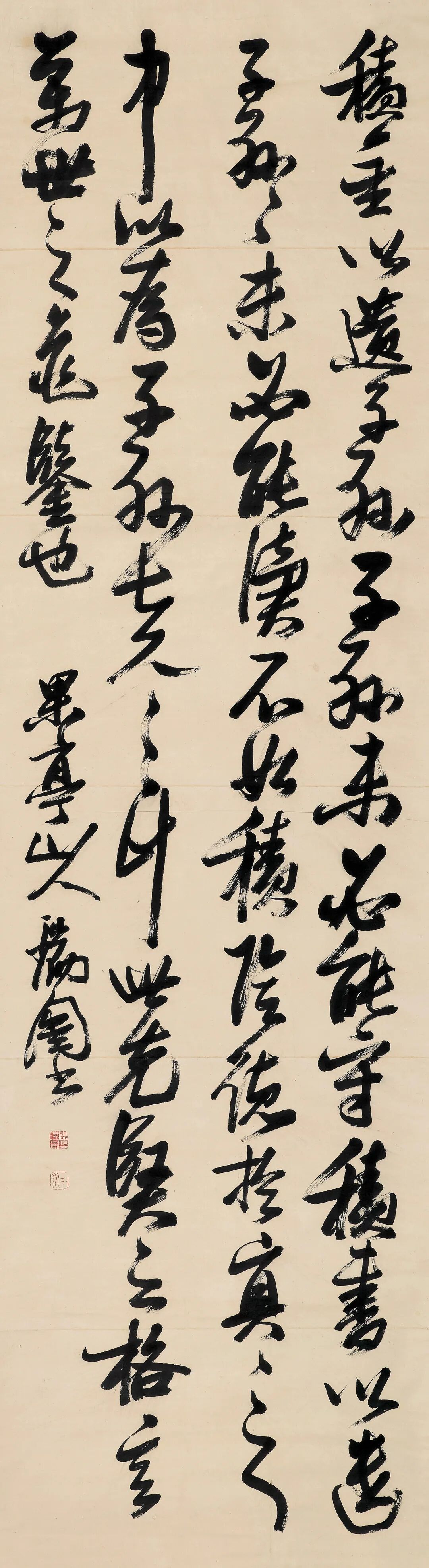 张瑞图作为晚明最有创造性的书家之一,以此格言巨轴为代表的大幅长轴的探索,在内容上一扫不激不厉、庄重典雅的传统范式,而代之以激越奇崛的气象,名义上师法古人,实则别出心裁,洋溢着创新精神。时人赞为“奇恣如生龙动蛇,无点尘气”。清人梁巘《承晋斋积闻录》曰:“圆处悉作方势,有折无转,于古法为一变。”《评书帖》又曰:“瑞图行书初学孙过庭《书谱》,后学东坡草书《醉翁亭》,明季书学竞尚柔媚,王(王铎)、张(张瑞图)二家力矫积习,独标气骨,虽未入神,自是不朽。”![]()