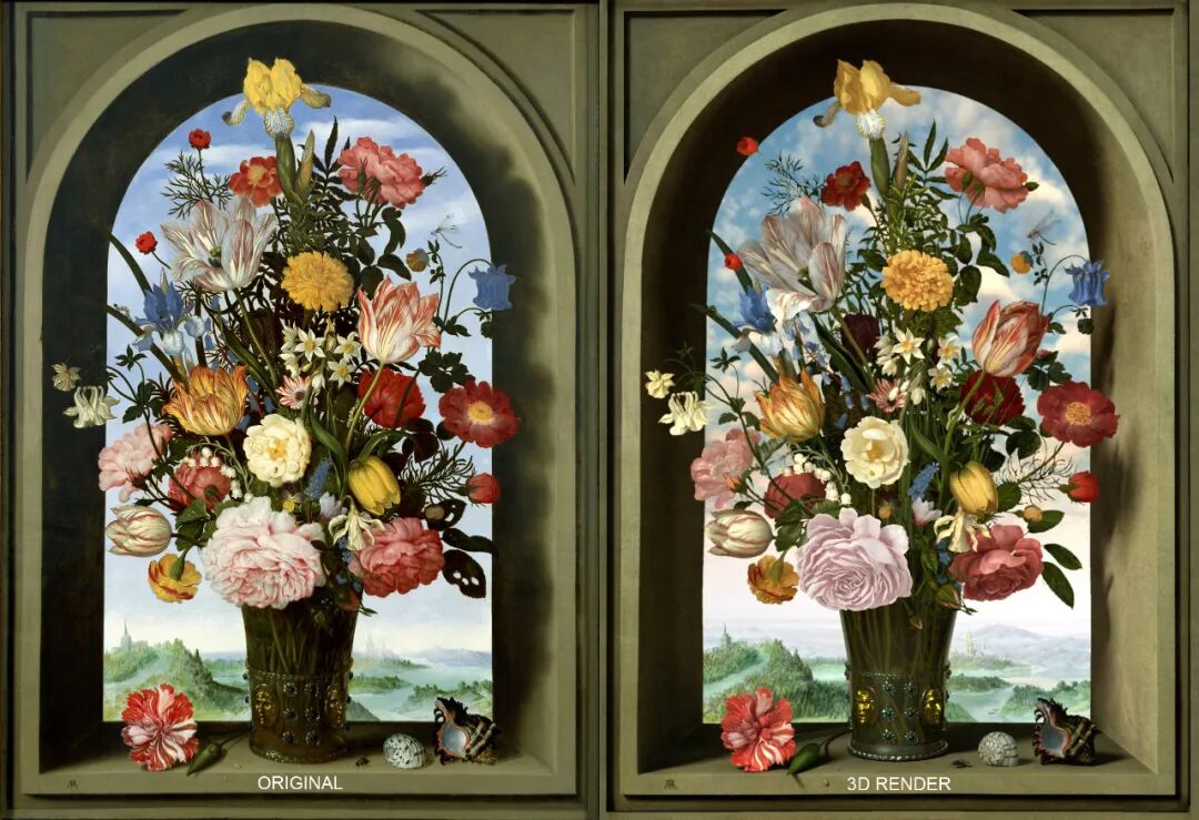 有的是 CGI + 现场拍摄,有的只是 CGI,还有一些纯粹是现场拍摄。正如波什尔特的《窗前花卉》的构图舞台化程度很高(因为很多花不会同时盛开),我们的制作方式跟古典油画那逼真性与舞台感产生共鸣。除了探讨古典油画中的细节的再创潜力之外,我们也会探索荷兰黄金时代绘画的不同主题,例如肖像画和虚空画。