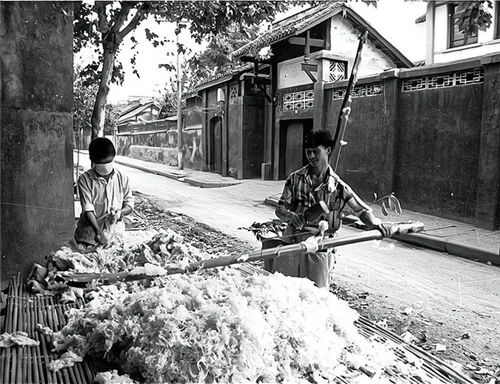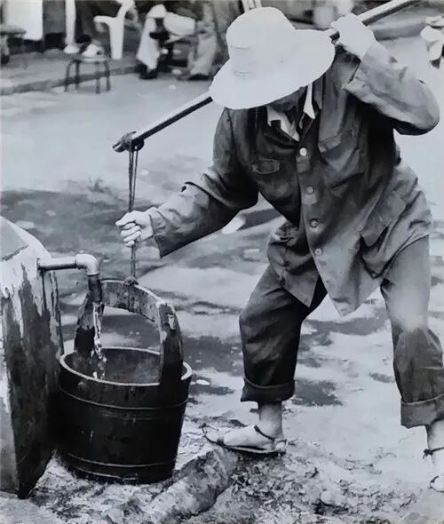 致民路,生产组工人码放铁桶