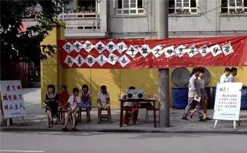 新华西路,几个小学生在路边做宣传(1985)