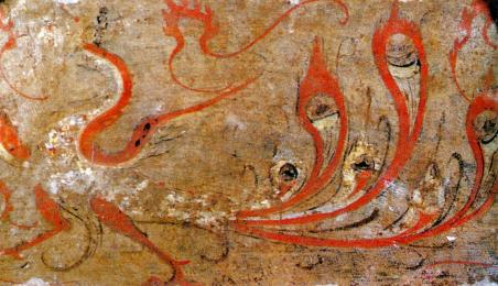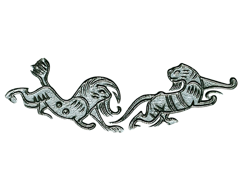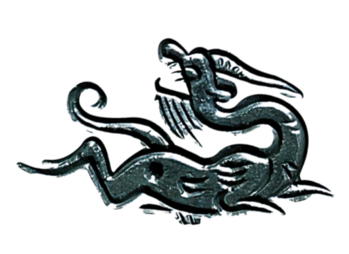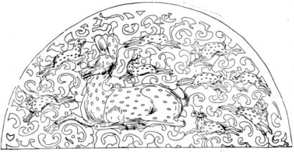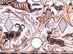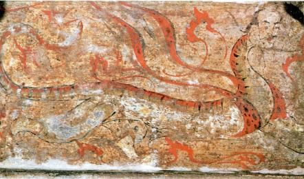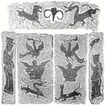 白虎身后的这只神兽,鬃毛极为发达,自颈后倒竖至面前,状似镇墓猛兽的突刺。这只神兽或如镇墓兽一样,有避邪的作用。