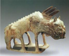 汉晋时期的镇墓兽,多有犄角或突刺。这往往是辟邪类神兽的特征,比如穷奇的“蝟毛”和獬豸的“一角”。