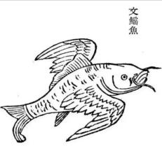 《山海经·西山经》记载,泰器之山“多文鳐鱼,状如鲤鱼,鱼身而鸟翼,苍文而白首,赤喙,常行西海,游于东海,以夜飞。”