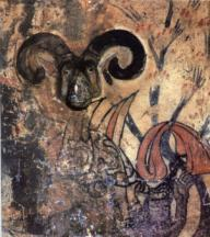 此镜中的羊以正脸示人,不同于多数神兽的侧脸形象。这种表现方式或与汉墓中将羊头造型塑于门楣之上的用意相同,即用于避邪。如《杂五行书》曰:“悬羊头门上,除盗贼。”此外,因与“祥”相通,羊也有吉祥的涵义。