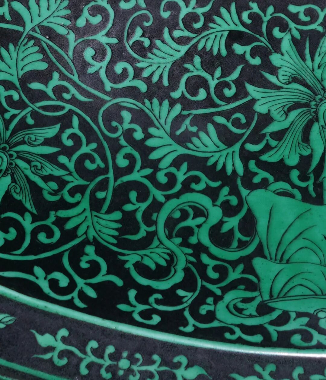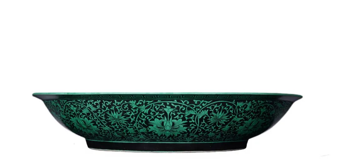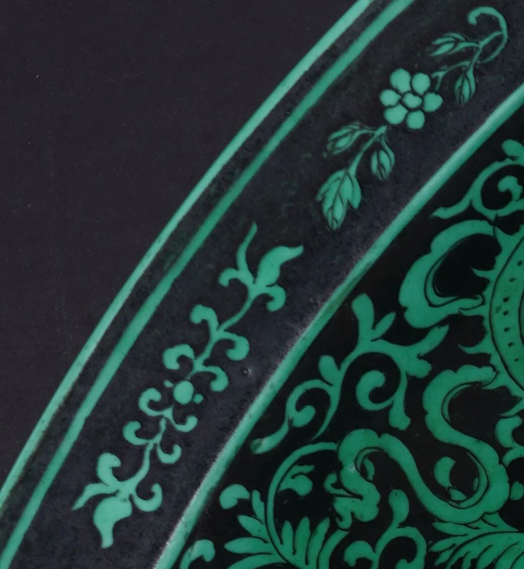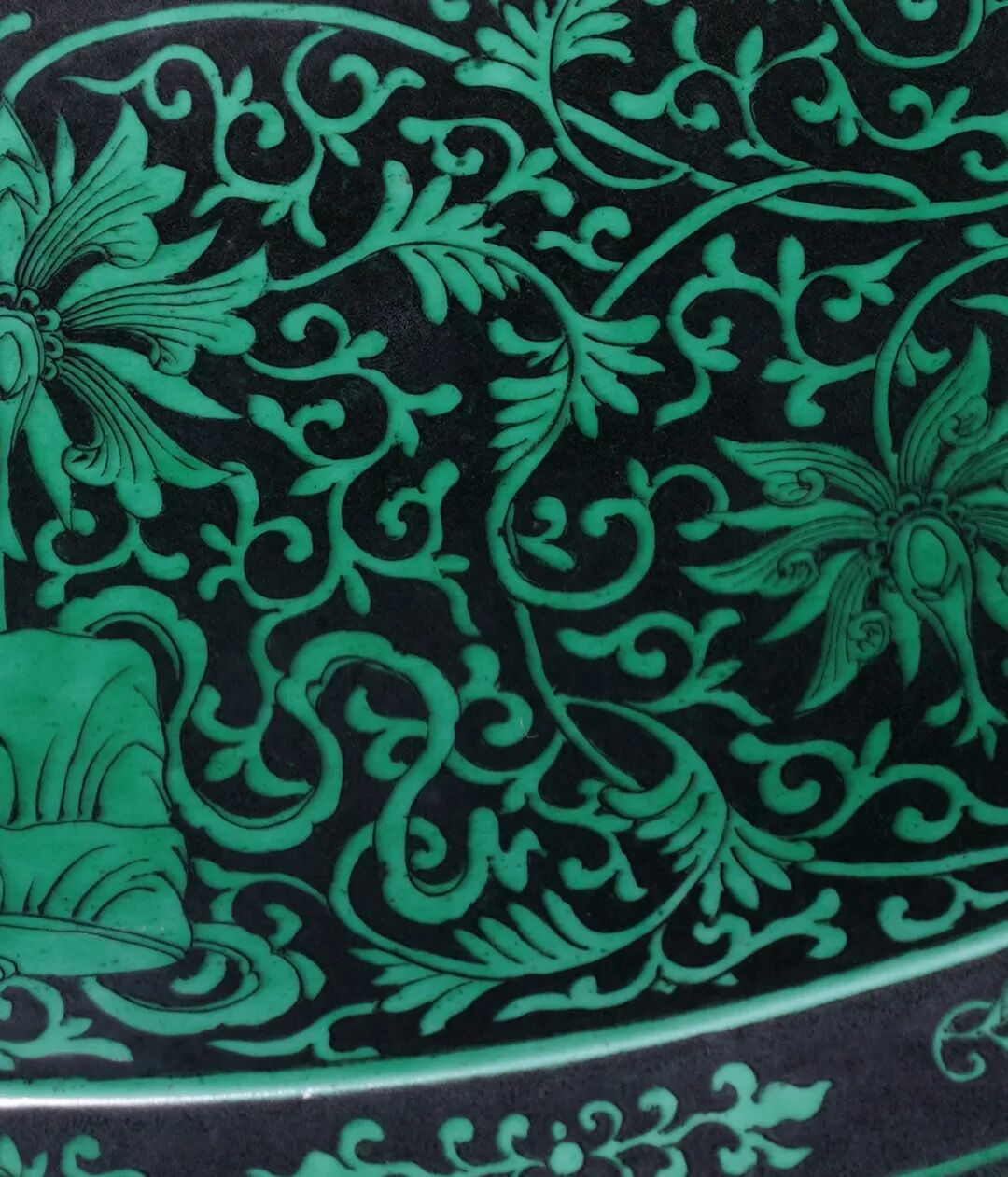 本品是为乾隆朝墨地绿彩瓷器寥寥可数的珍品之一,其体量巨大,为同类釉色装饰作品中传世所见最大一例。