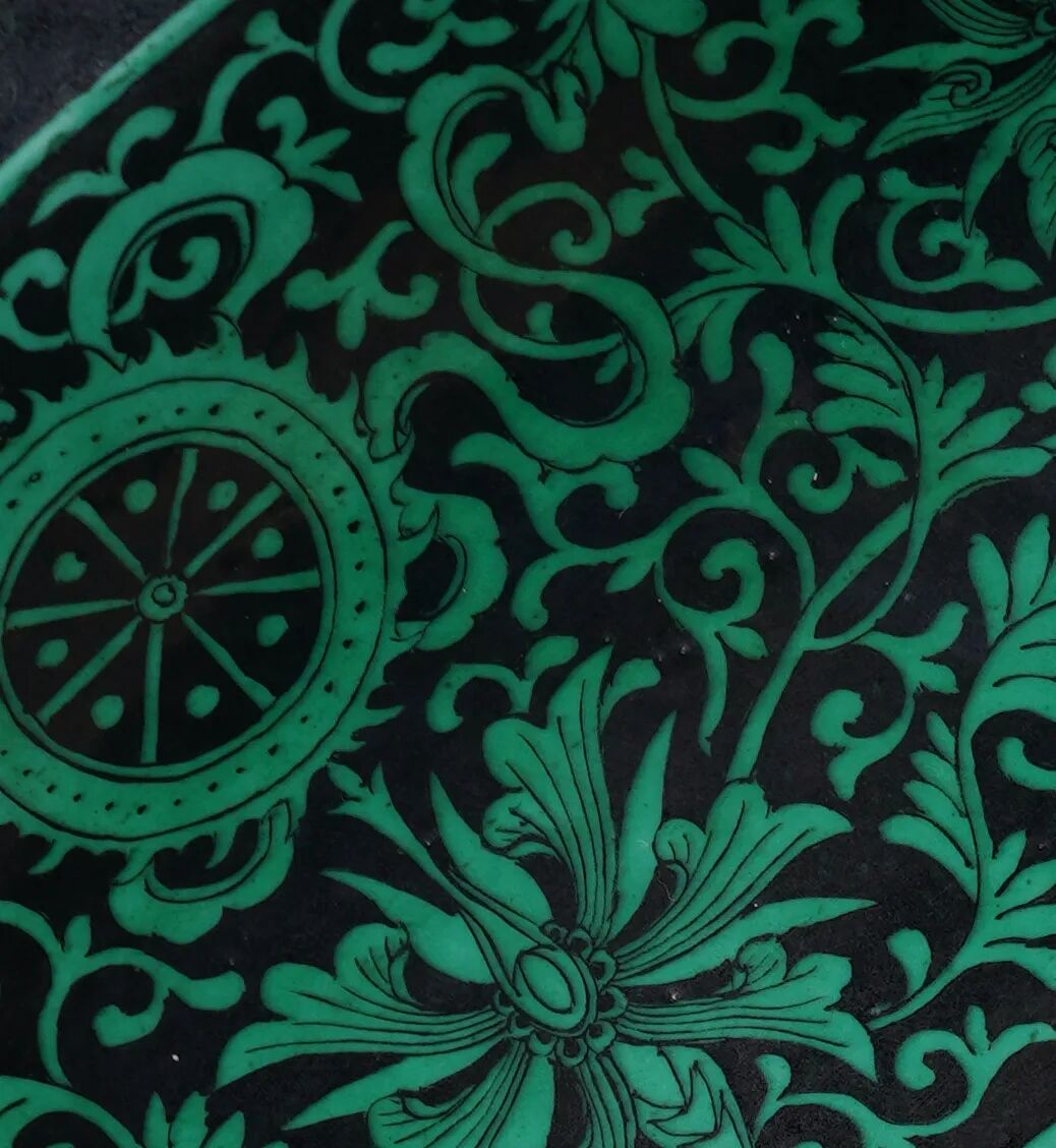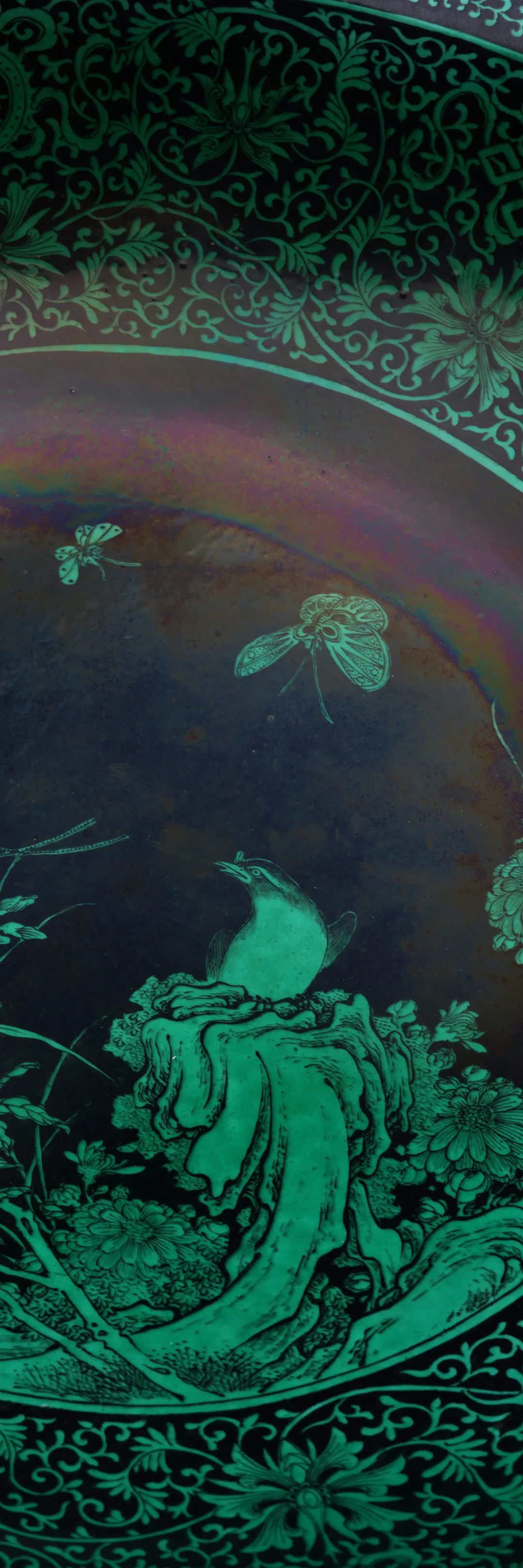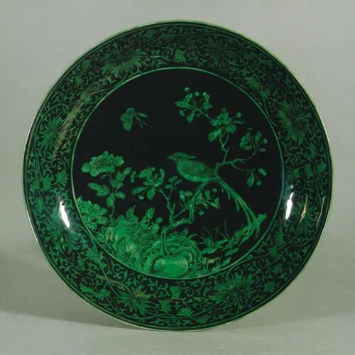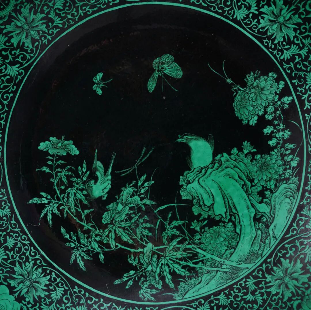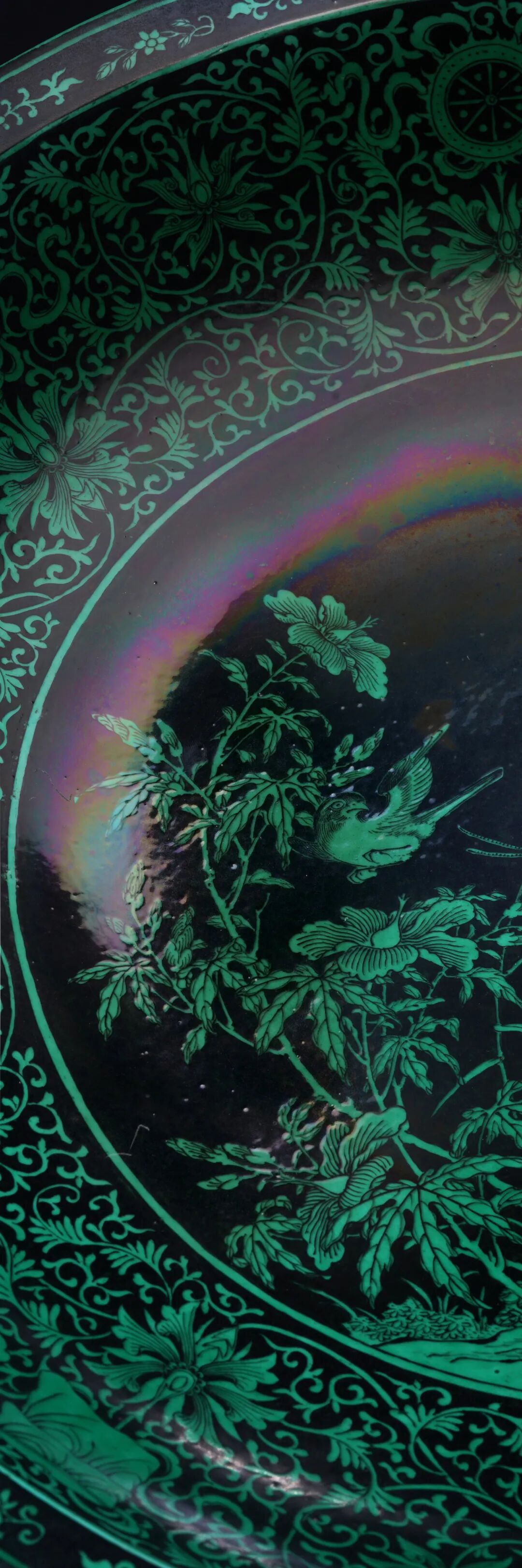 本品是为乾隆朝墨地绿彩瓷器寥寥可数的珍品之一,其体量巨大,为同类釉色装饰作品中传世所见最大一例。
