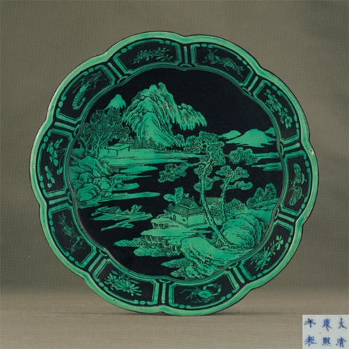 时至雍正至乾隆,其工艺相较宋代便更为精妙,需先在高温烧好的素瓷上用“珠明料”描绘纹样,并填满纹样空白处,然后在整个画面上覆盖一层水绿色料,待干后入窑二次低温烘烧。所谓“珠明料”,产于云南宣威、会泽、宜良等地,明嘉靖以后用于烧造青花瓷器。云南所产上等青花料被称为“金片”或“珠密”,“珠明”即“珠密””之音转。珠明料氧化钴含量高,烧成后发色浓艳,呈翠蓝色。用珠明料制作色泽纯正的黑彩,是康熙时期的一大发明。