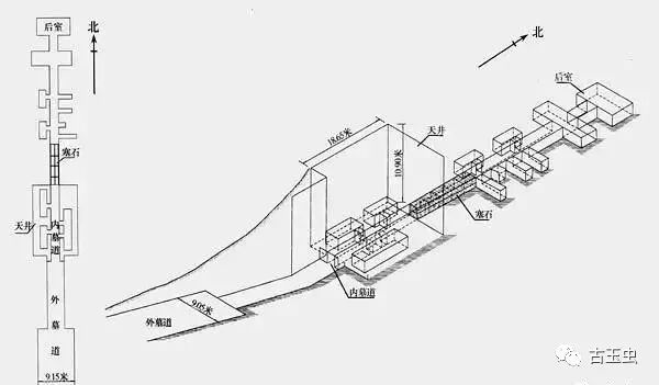 陵墓墓道分内外中内三部分,外段长29米,宽9米,未开凿成规整的斜坡,底部岩石高低起伏,为了便于下葬,在残石上用夯土做成斜坡道。中段墓道长20米、宽3.5米,内墓道上部有一长18.65米、宽13.2米、南端深8.45米、北端深10.9米,面积达240多平方米的巨大天井。