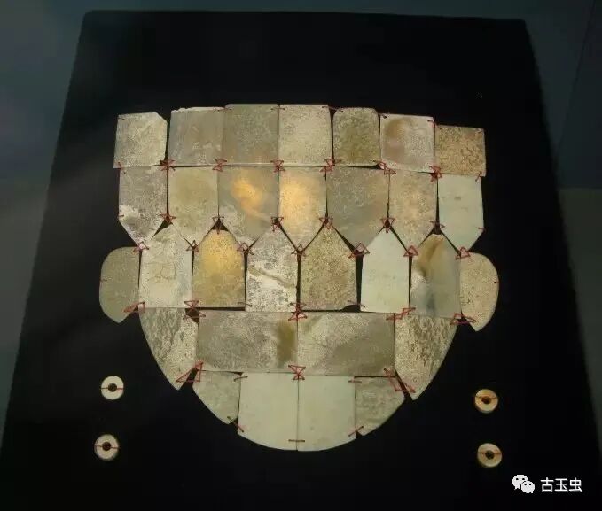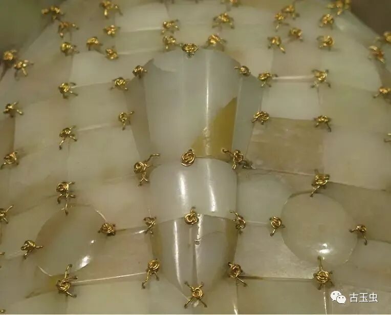 因盗墓者抽取金丝,玉衣在发掘时已散乱各处,大体能够复原完整。这具玉衣所用玉料产自新疆和田,质地温润光泽,有正方形、长方形、半月形、三角形等多种形状,裁片精薄,侧面刮棱,表面抛光,四角或周边单面钻孔,孔径尤小。玉衣片尺寸较小,最大的不足9平方厘米,最小的不足1平方厘米,有的厚度仅1毫米。