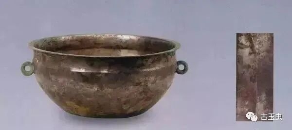 楚王御用银质沐浴器自名日“鋗”。腹壁上阴刻一组铭文:“宦者尚浴沐鋗容一石一斗八升重廿一斤十两十朱第一御”,这段铭文注明了该器所属的官署、用途、器名、容积、重量和编号。