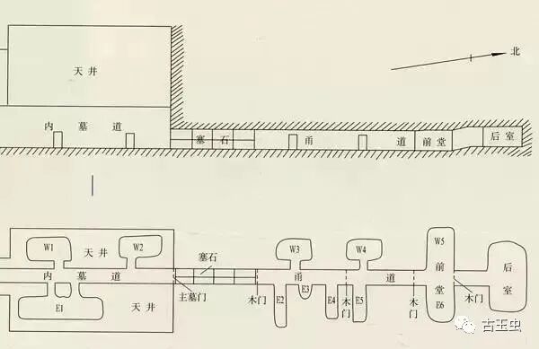 西汉初期出现了“斩山为椁,穿石为藏”的大型横向石室墓,可是,沿用了数千年的竖穴椁墓不可能在短时间内失去影响,横向石室墓在初兴之时,在形制上以及工程的设计上,必定会对竖穴椁墓有所遵循,不单如此,以狮子山楚王陵墓为例,其天井很可能原计划建造一座竖穴岩坑墓的主体部分,之后由于某种原因而改凿成横向洞室墓葬。