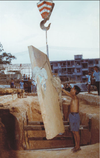 1995年,广州市长途电话局在中山四路北面的忠佑大街城隍庙西侧计划兴建一座25层高的综合大楼,由于施工现场周围都是高层楼宇,而且地下水丰富,深挖难以保证安全,容易塌方,因此,施工单位在一个面积约1800平方米的建筑范围内,构筑了一匝宽1.2、深10多米的钢筋混凝土连续墙,并把工地内地表以下4米左右的土层用机械挖去。