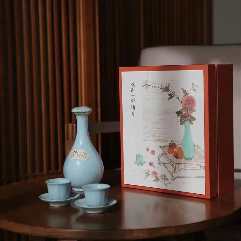 “花间一壶酒”礼盒包括:汝瓷玉壶春瓶一只+赖茅佳酿358ml 53° 酱香型+ 汝瓷杯碟4只 + 中式挂画一件