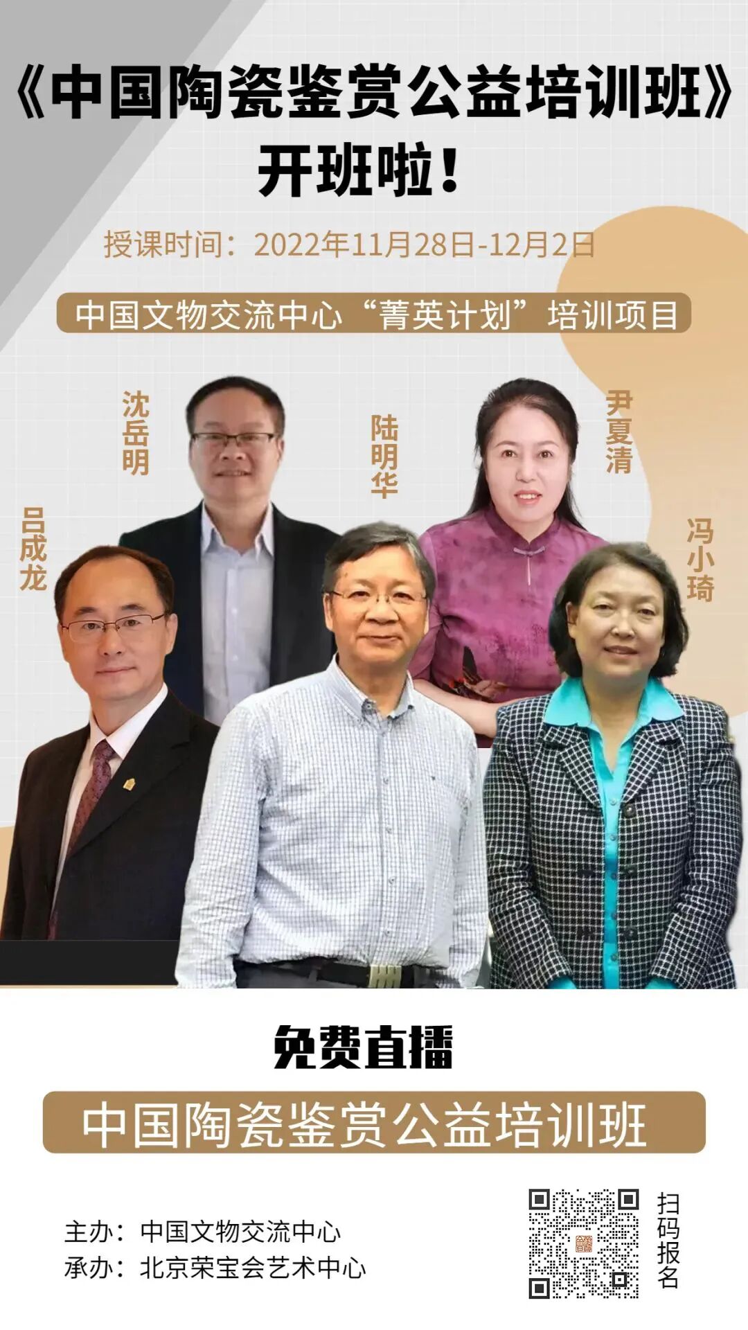 近期,第二期培训项目即将拉开帷幕,五位国内顶尖陶瓷鉴赏专家:中国古陶瓷学会副会长、上海古陶瓷科学技术研究会副理事长陆明华;国家文物鉴定委员会委员、北京故宫博物院古器物部研究员冯小琦;全国政协委员、故宫博物院器物部主任吕成龙;复旦大学教授、博士生导师、中国古陶瓷学会常务副会长沈岳明;西北大学文化遗产学院教授、博士生导师、陕西省文物鉴定委员会副主任尹夏清,将于11月28日至12月2日开展“中国陶瓷鉴赏公益培训班”线上直播课,欢迎全国文博单位陶瓷从业人员及陶瓷爱好者免费报名参加!