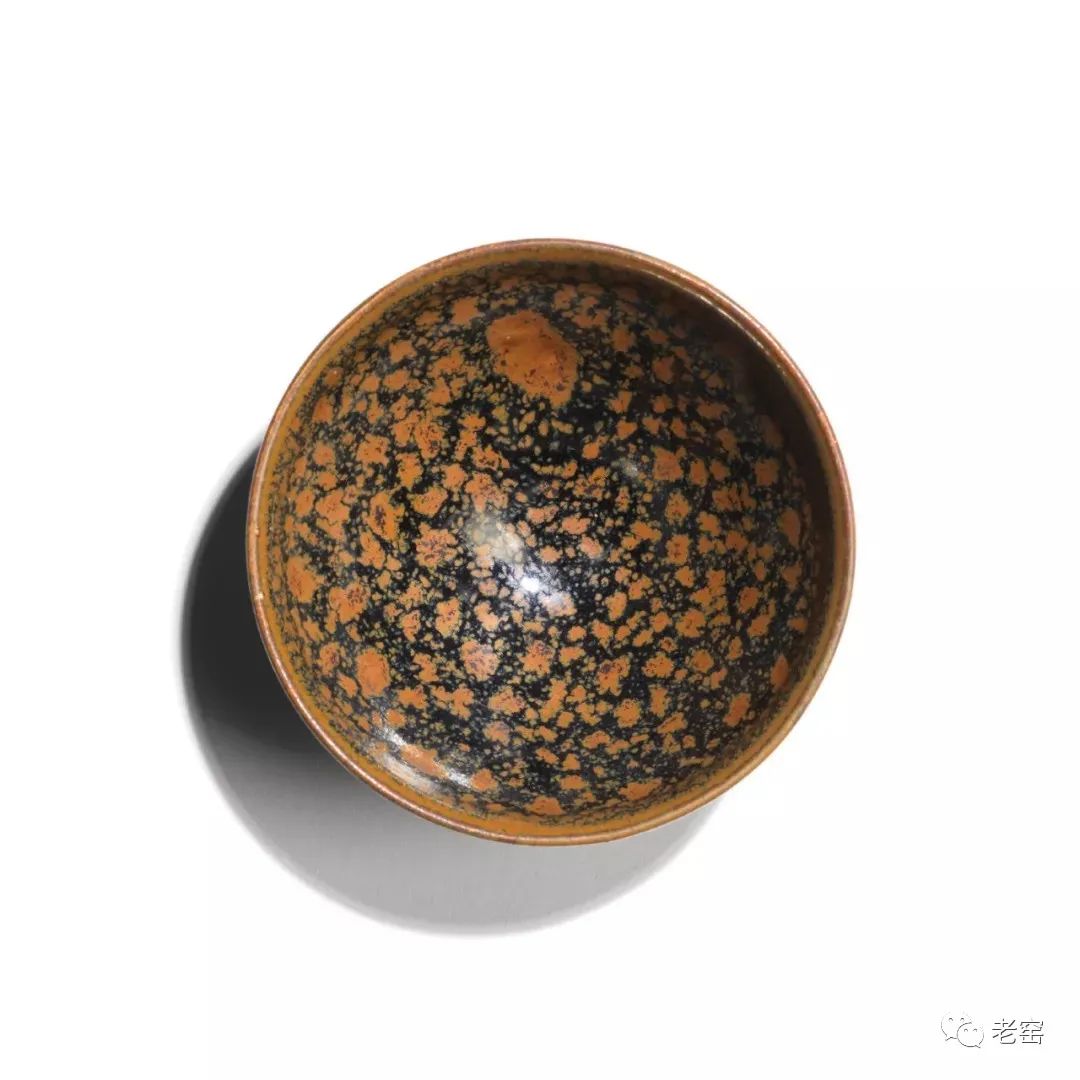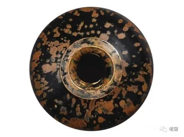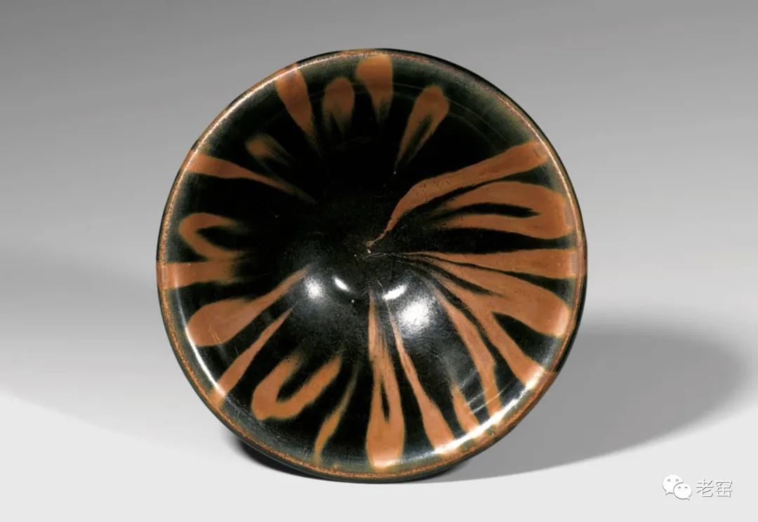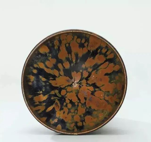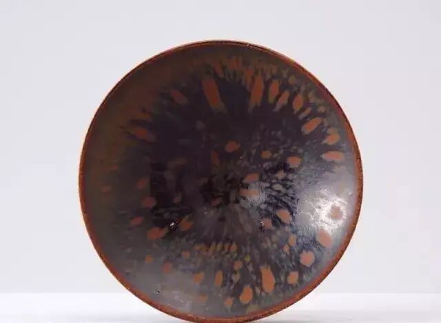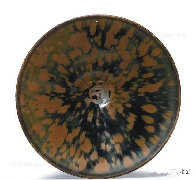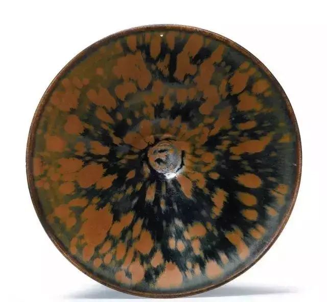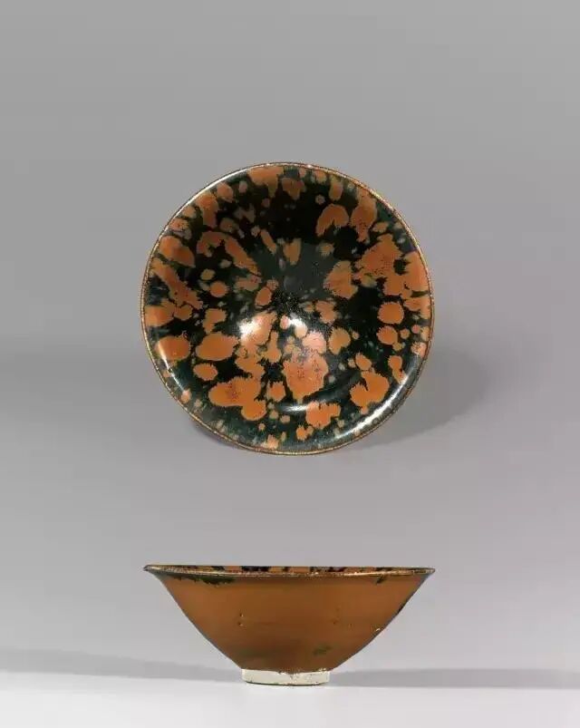 画上去的铁锈花一般有两种图案,一种是像这只玉壶春的花草,另一种是飞鸟。由于铁锈花是从釉子里析出来的铁结晶,是比较不规则且难控制的。所以这种装饰技法,不能像白地黑花那样,画出细致的图案。宋人于是采用了大写意笔法,潇洒的寥寥数笔,完成主题图案。这种写意的装饰,经常出现在体量比较大的器物上,如玉壶春瓶、嘟噜瓶等。唯有大器,才能展现大写意的美。淋洒出来的铁锈花,更注重自然随意的效果。随性的淋洒大多使用在小件器物上,比如最常见的茶盏。我们在聊定窑黑釉的时候,看到过淋洒了少量铁锈斑的茶盏。如果说定窑的铁锈斑像流星,磁州窑的铁锈斑就像绚丽的焰火。绽放的淋漓斑点,不包含任何具象的含义,仅仅是最单纯的抽象装饰。![]()