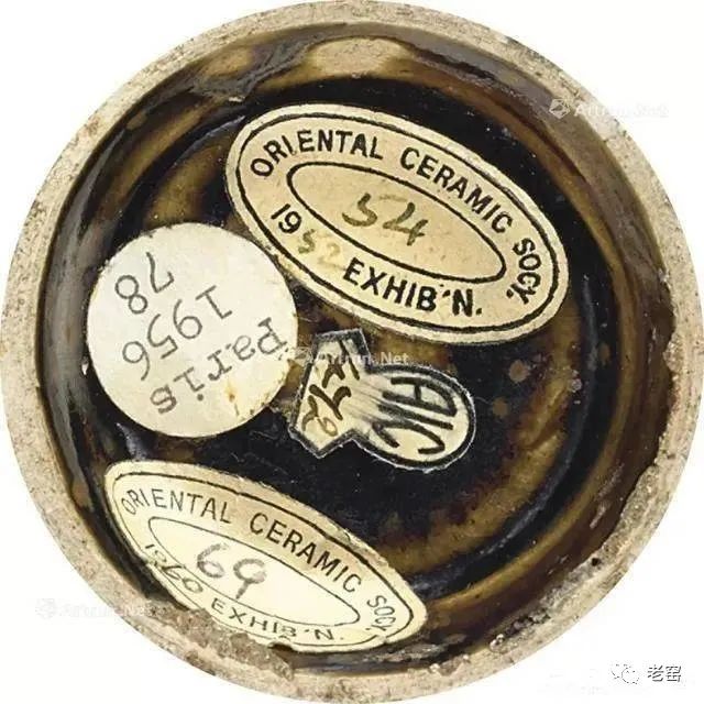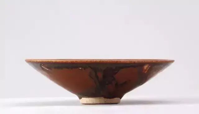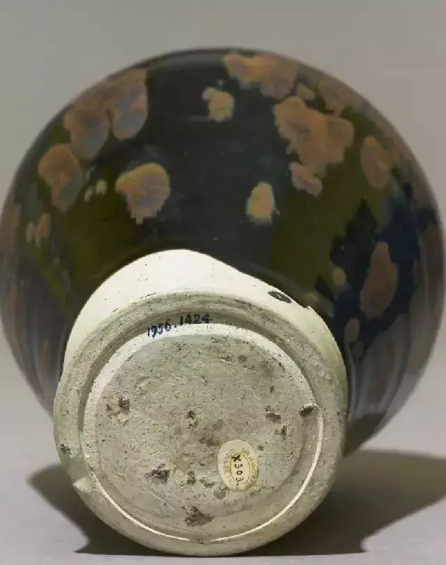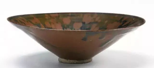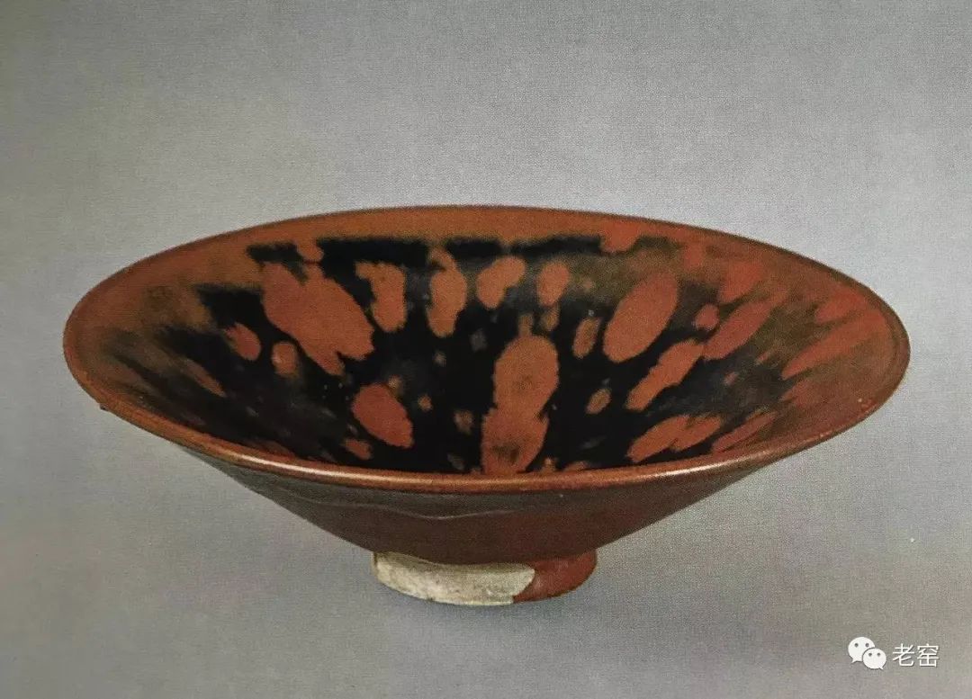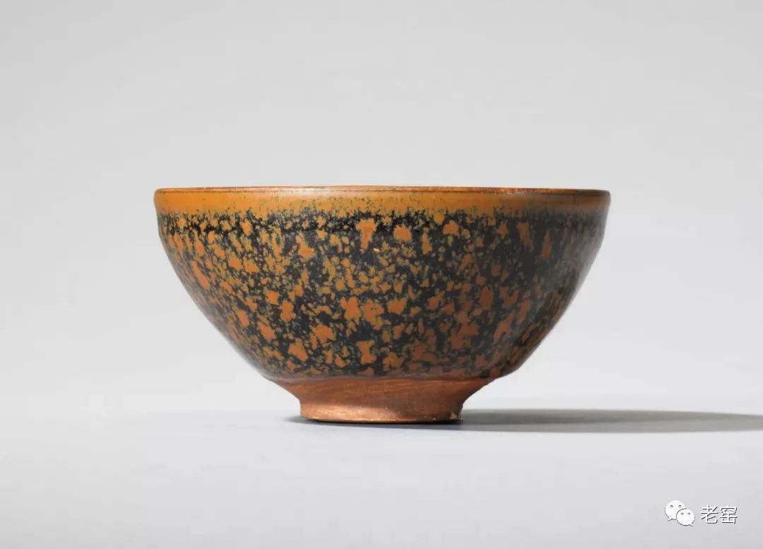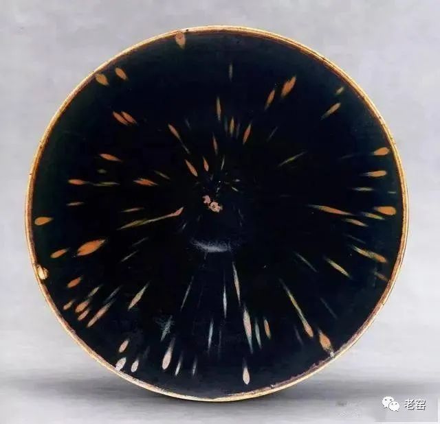 画上去的铁锈花一般有两种图案,一种是像这只玉壶春的花草,另一种是飞鸟。由于铁锈花是从釉子里析出来的铁结晶,是比较不规则且难控制的。所以这种装饰技法,不能像白地黑花那样,画出细致的图案。宋人于是采用了大写意笔法,潇洒的寥寥数笔,完成主题图案。这种写意的装饰,经常出现在体量比较大的器物上,如玉壶春瓶、嘟噜瓶等。唯有大器,才能展现大写意的美。淋洒出来的铁锈花,更注重自然随意的效果。随性的淋洒大多使用在小件器物上,比如最常见的茶盏。我们在聊定窑黑釉的时候,看到过淋洒了少量铁锈斑的茶盏。如果说定窑的铁锈斑像流星,磁州窑的铁锈斑就像绚丽的焰火。绽放的淋漓斑点,不包含任何具象的含义,仅仅是最单纯的抽象装饰。![]()