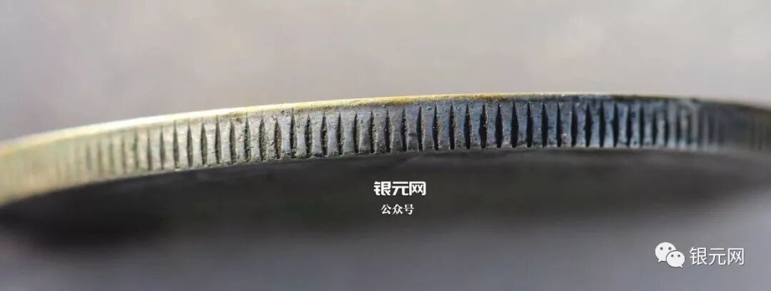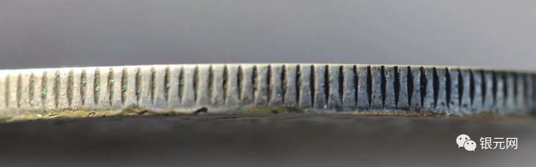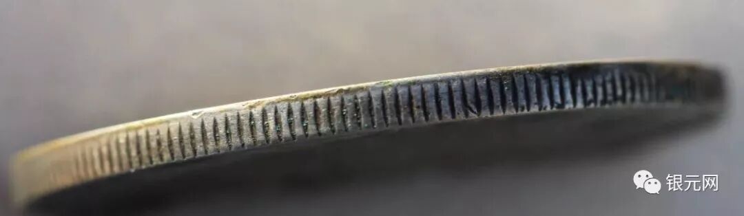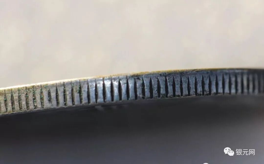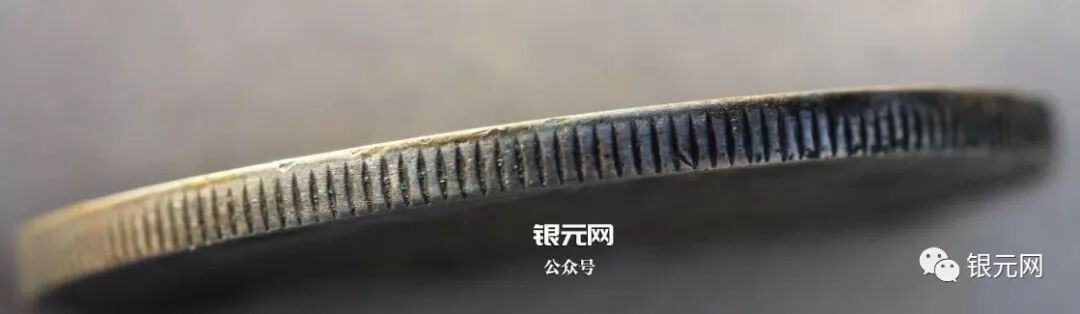 2、长城暗记,在正面下方5点至7点位置若隐若现有长城形状的暗记,小弟认为这是当年撞模所致,因为一枚打铸过的银币还没有完全从模具里拿出来,冲压机再次冲击,导致银币的内齿将正面模下方损伤,就像十年通常背面出现的衣领一样,说是暗记,其实只是一个特征罢了。(这个话题有待探讨)仿品暗记非常清晰,有点此地无银的意思。