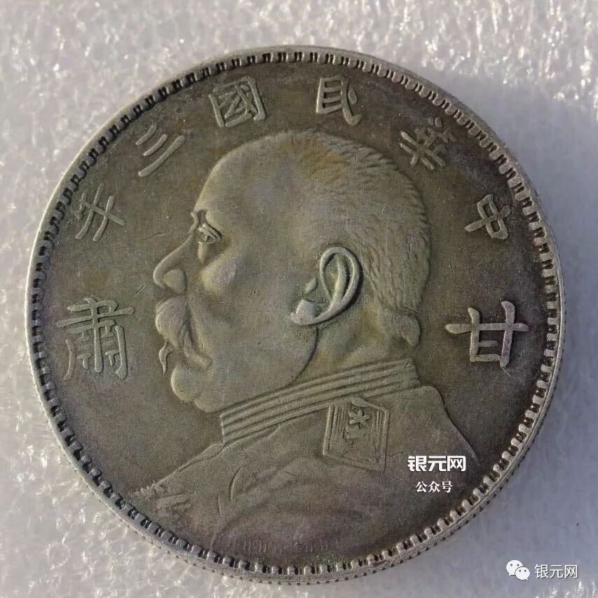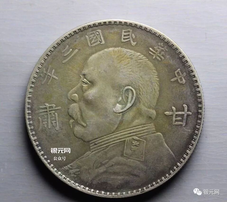 此币系民国19年(公元1930年)所铸,但仍沿用民国3年版的旧模,在正面袁像左右加铸‘甘肃’二字,标明是甘肃兰州造币厂铸造。铸额不多,仅数万枚。所见之品大都为赝品。该币特征除在正面袁像左右加‘甘肃’二字外,余均与开口贝版相同。