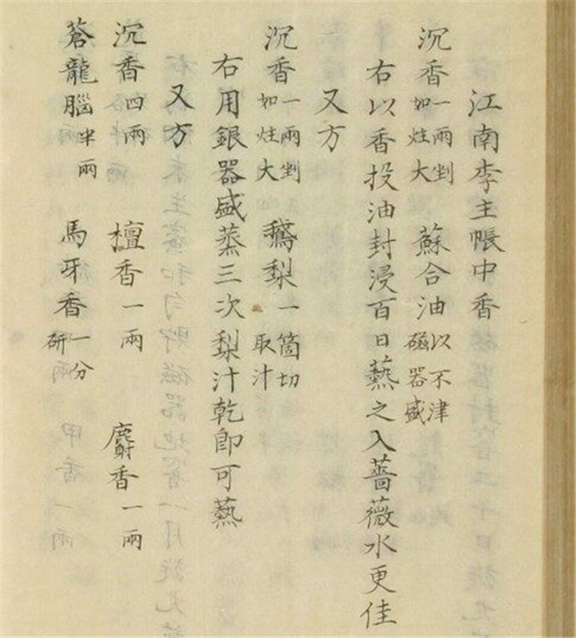 此香被收录在各朝代的香学书籍中,例如,明代周家冑编撰的《香乘》中就收录了四种“江南李主帐中香”的香方,其中两种香方均是以鹅梨与沉香、檀香蒸制而成:沉香末一两、檀香末一钱、梨十枚,右以鹅梨刻去穰核,如瓮子状,入香末,仍将梨顶签益,蒸三溜,去梨皮,研和令匀,久窨可熟。