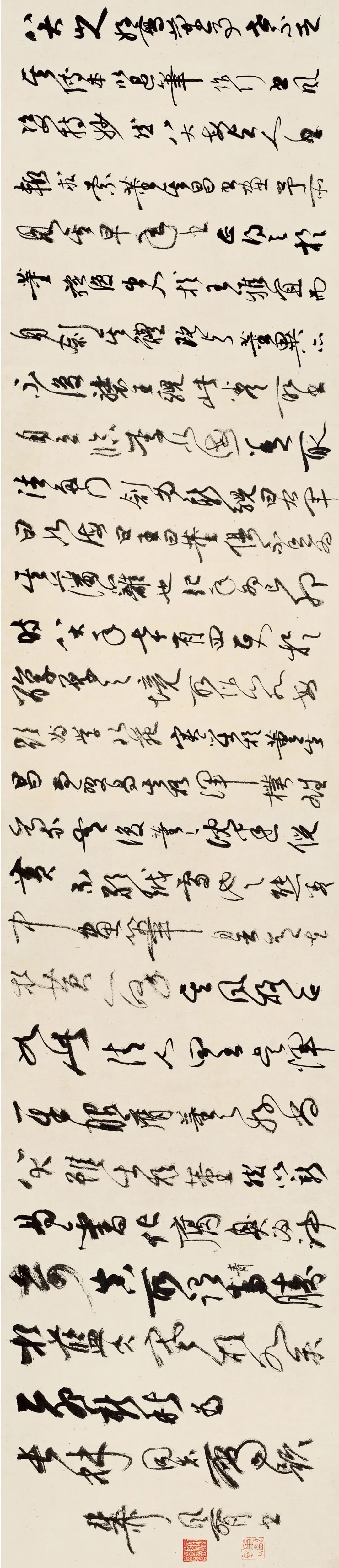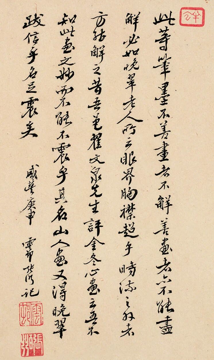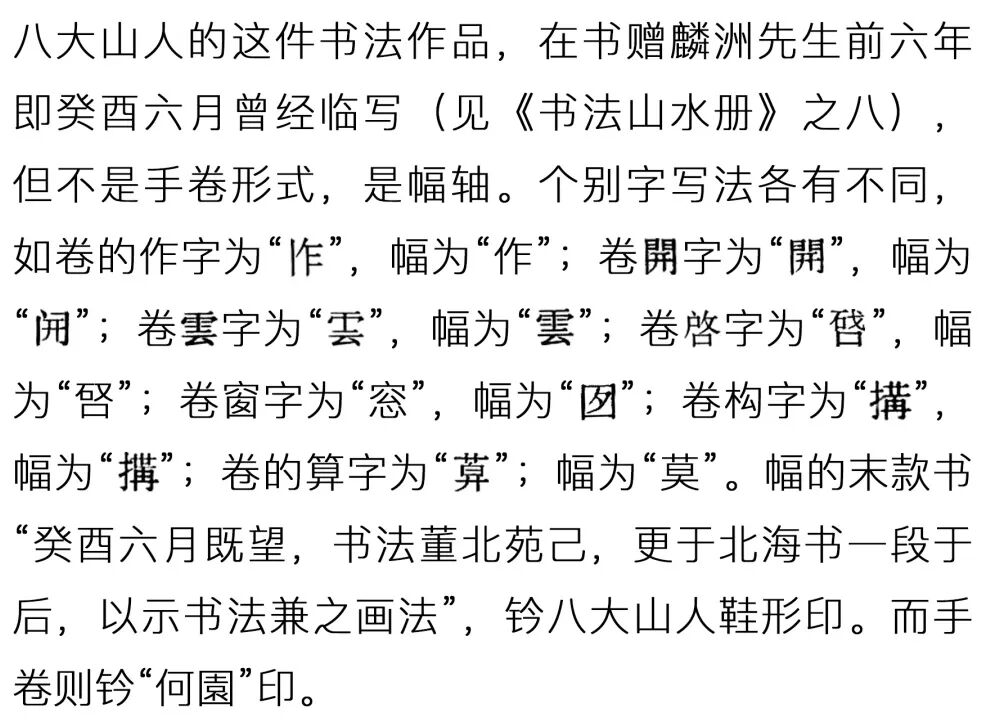 八大山人甚通书画用笔之法,但他更精书法,常“随性分而挹之”,是他“画法兼之书法”非常成功的经验,将绘画造型之法融入于书法表现之中。所以他的书法通过文字造型表现出来的神情风姿更美感意象,也是书法家灵性的回荡。八大山人晚年的书法更是风骨老辣,笔力雄健,简直是书中有画,这就是他将绘画的用笔高度运用到书法中去的成功,即画荷茎的“金钢杵”笔法。清人尤科宝评说八大“山人书法尤精”;石涛说他“书法画法前人前”;黄宾虹说他“书法第一画第二”。手卷题跋者俞剑华说八大山人书,自二王神髓中来,精纯圆润,继起无人,成为千古绝调,此卷尤为精妙入神。