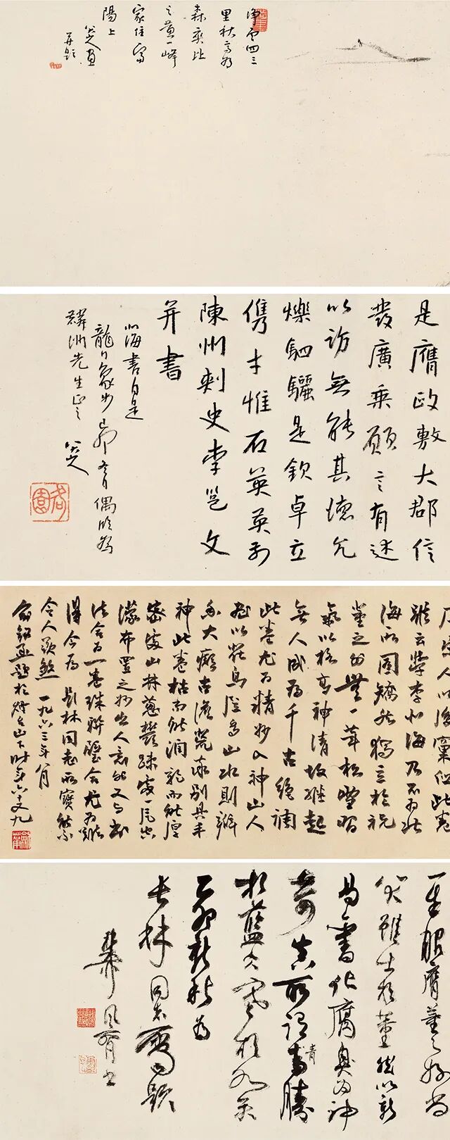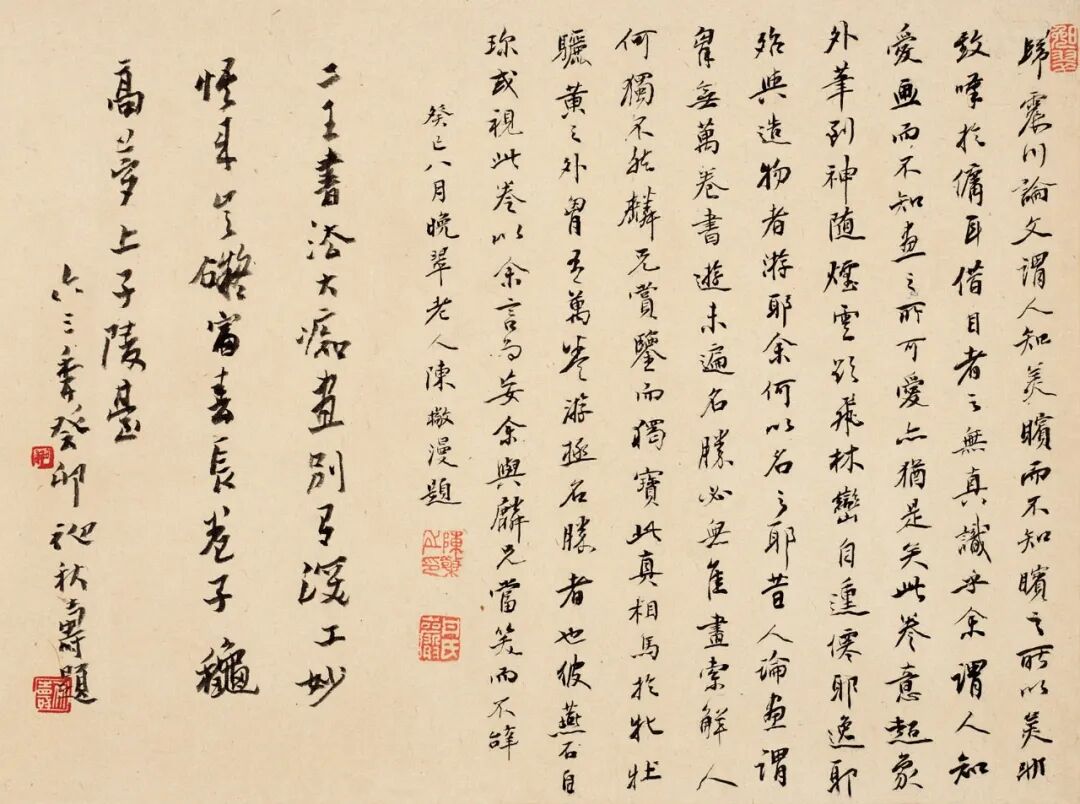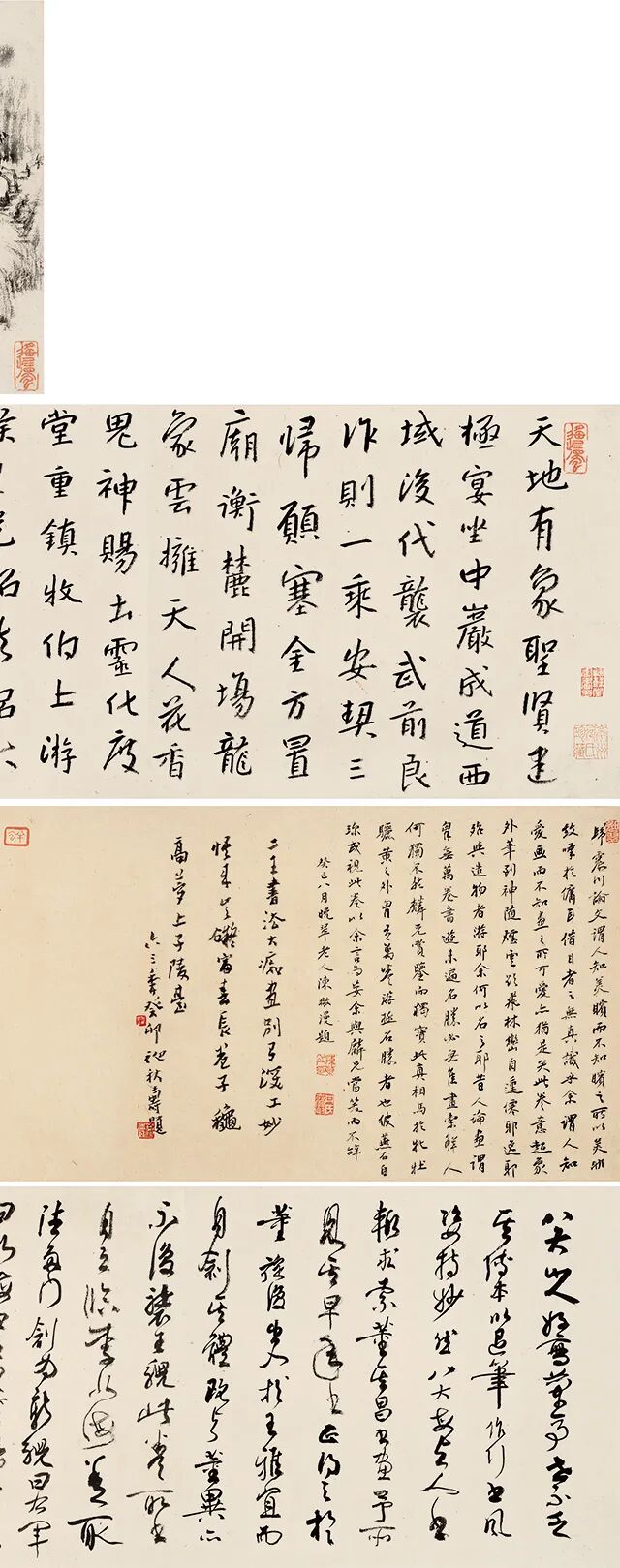 富阳山水书画合璧手卷,八大山人书绘,长26、宽123厘米,纸本,书为行书,画为水墨,题款己卯冬日,为馈赠麟洲先生之作。内容书为唐北海太守李邕文,多为临(读)李邕《麓山寺碑》文部分,署八大山人,钤“何園”朱印。画为富春江山水,题诗为“净土四三里,秋高为森爽。比之黄一峰,家住富阳上”。(东晋咸安二年以富春县改为富阳,在富春江上)署八大山人画并题,钤“涉事”及鞋形“八大山人”朱印各一方。画末有癸巳晚翠老人陈橄、咸丰庚申(一八六O年)张弼、癸卯初秋寿(潘天寿)、癸卯王个簃、一九六三年俞剑华、己卯谢稚柳等人题跋。