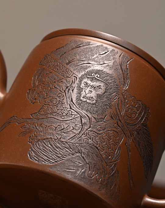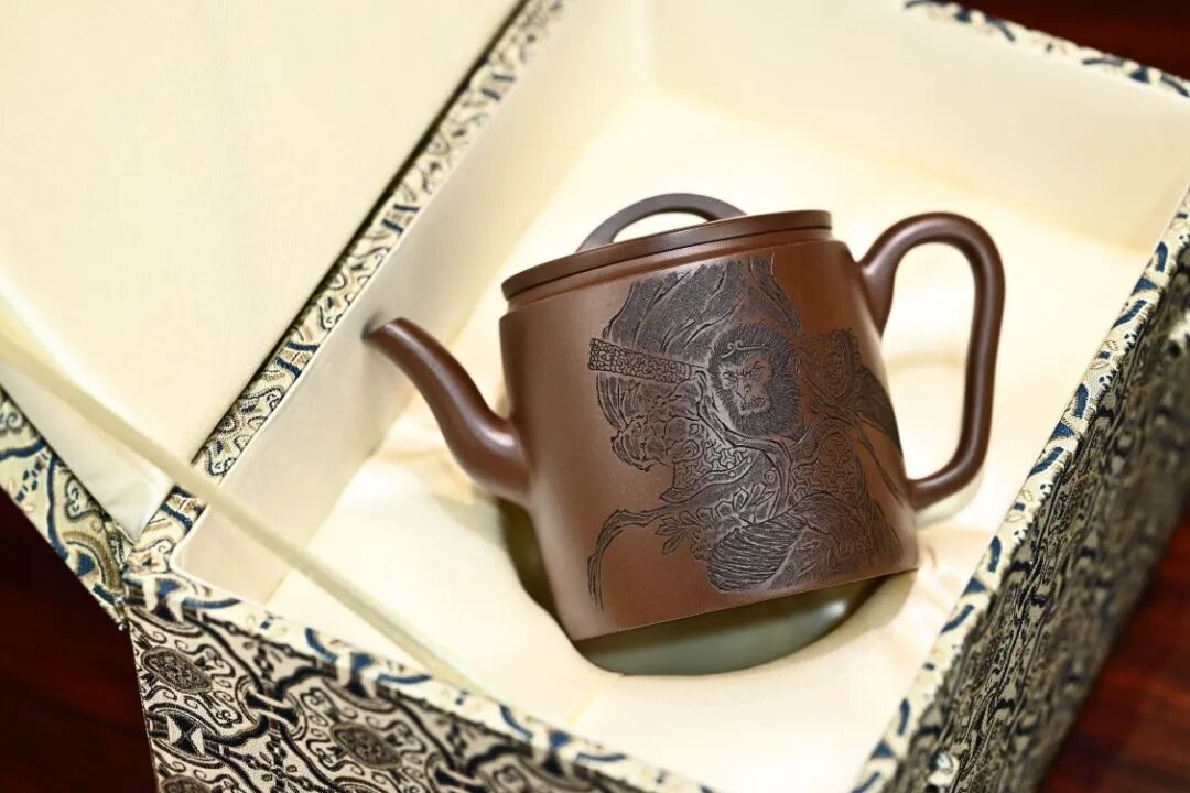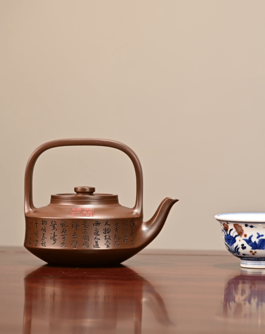 古典雅致,整个壶盖为玉璧实形,《周礼》曰“以苍璧礼天”,集书法、名画于一身,刻工犀利,入木三分!玉璧为沟通天地、象征日月的礼天之玉。