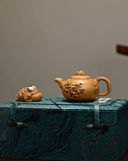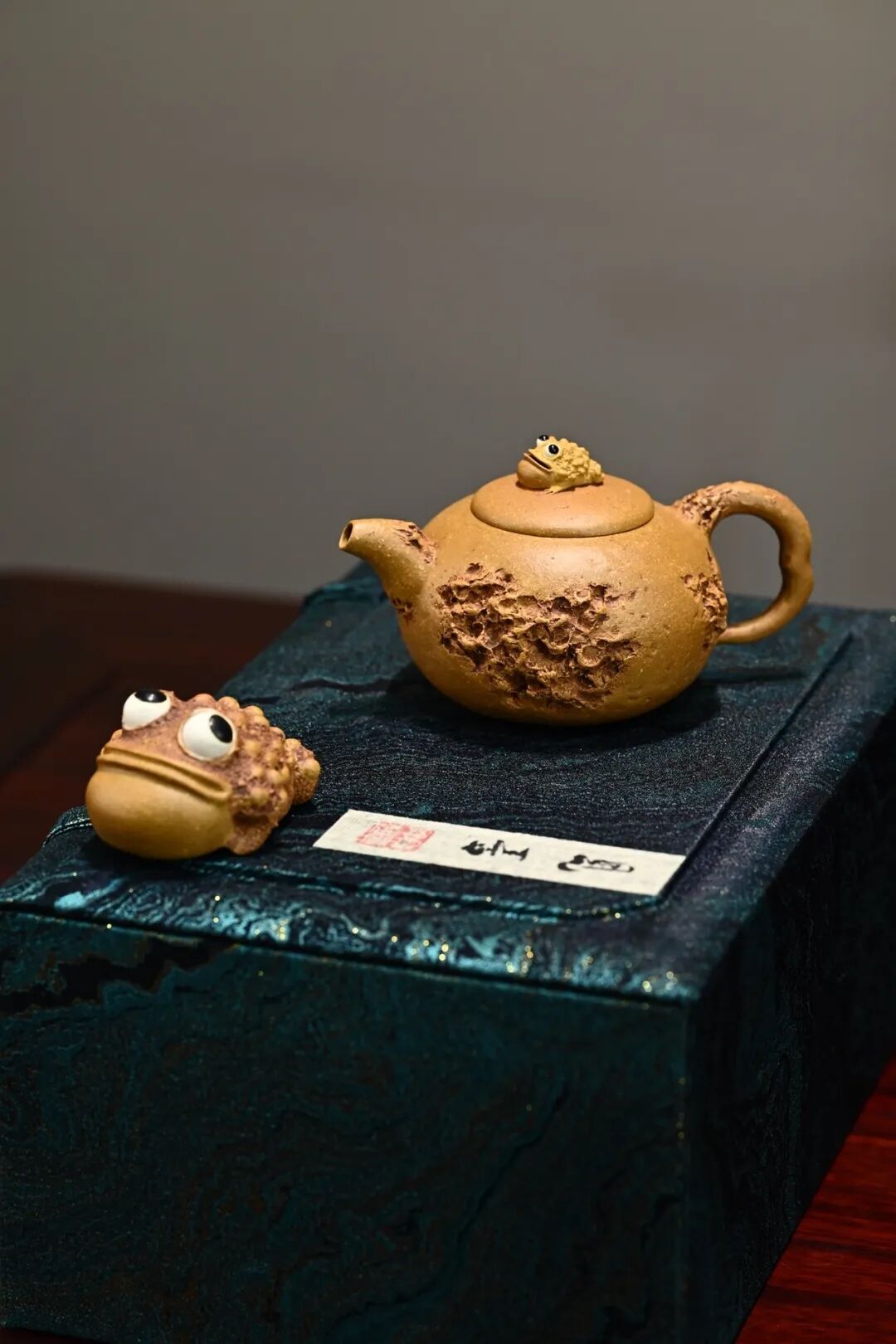 壶身肌理犹如自然质朴,若隐若现,伴以可爱的金蟾茶宠相映成趣,寓意吉祥如意。