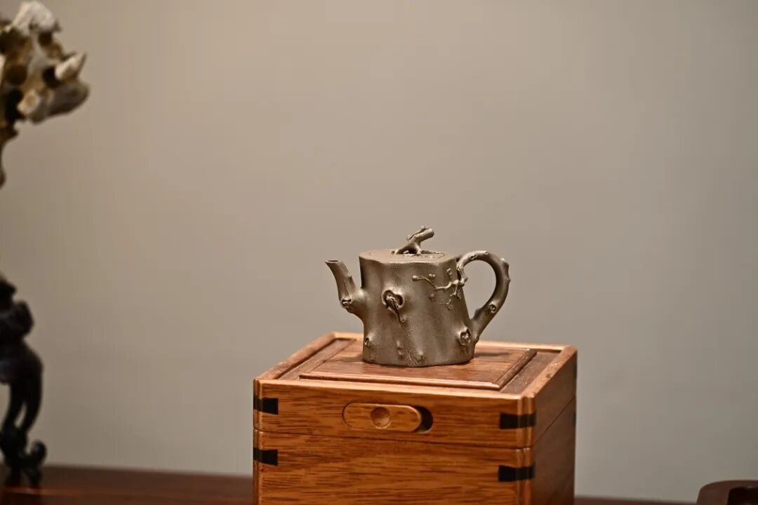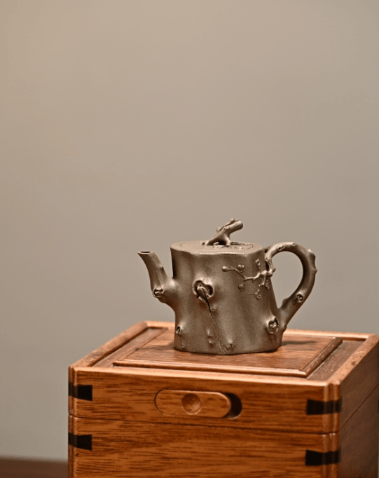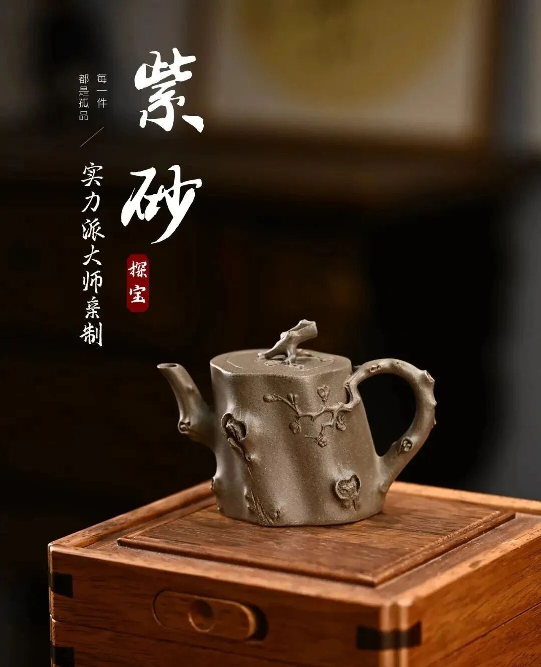 此壶选取家藏冷青段,由国家助理工艺美术师——黄思聪全手工制作,壶身形似梅桩,饰以断枝瘿节。