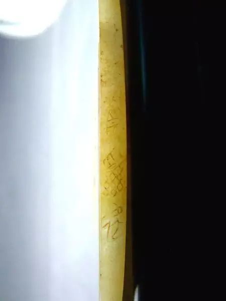 青白玉质,素面,有糖色及沁斑点。外缘刻有“己二百五十三”等铭文。