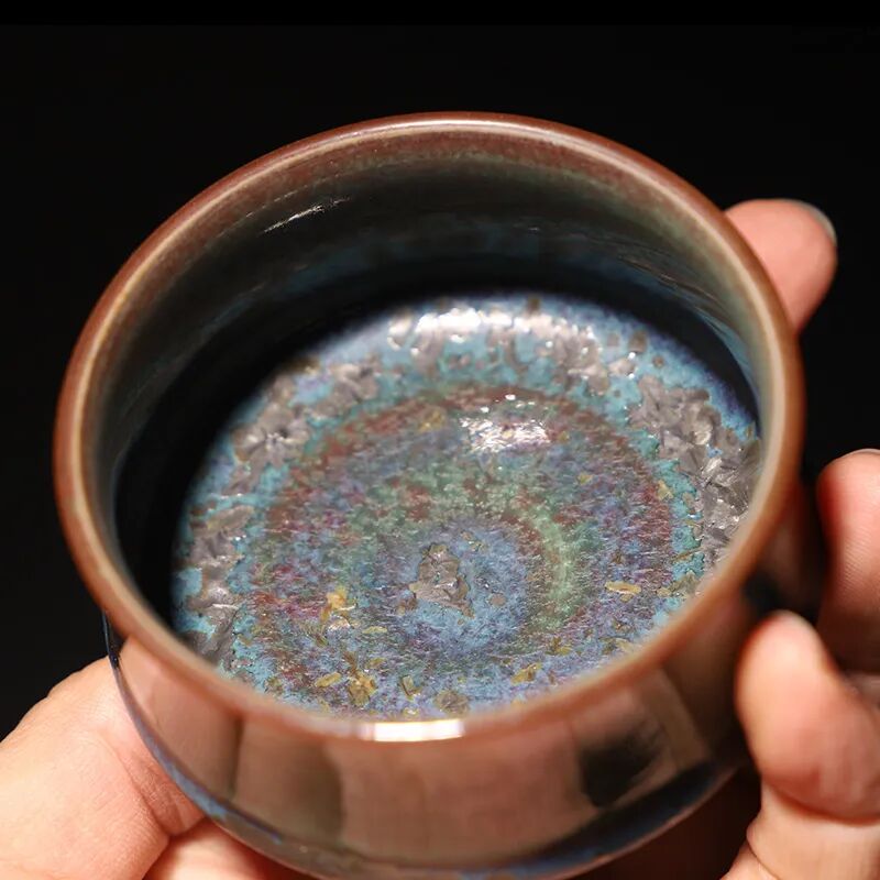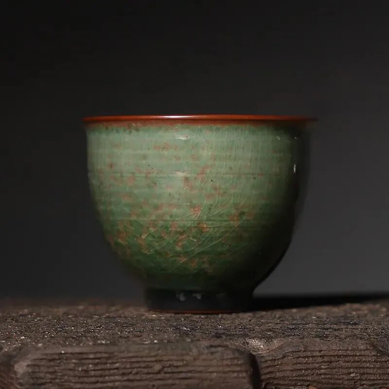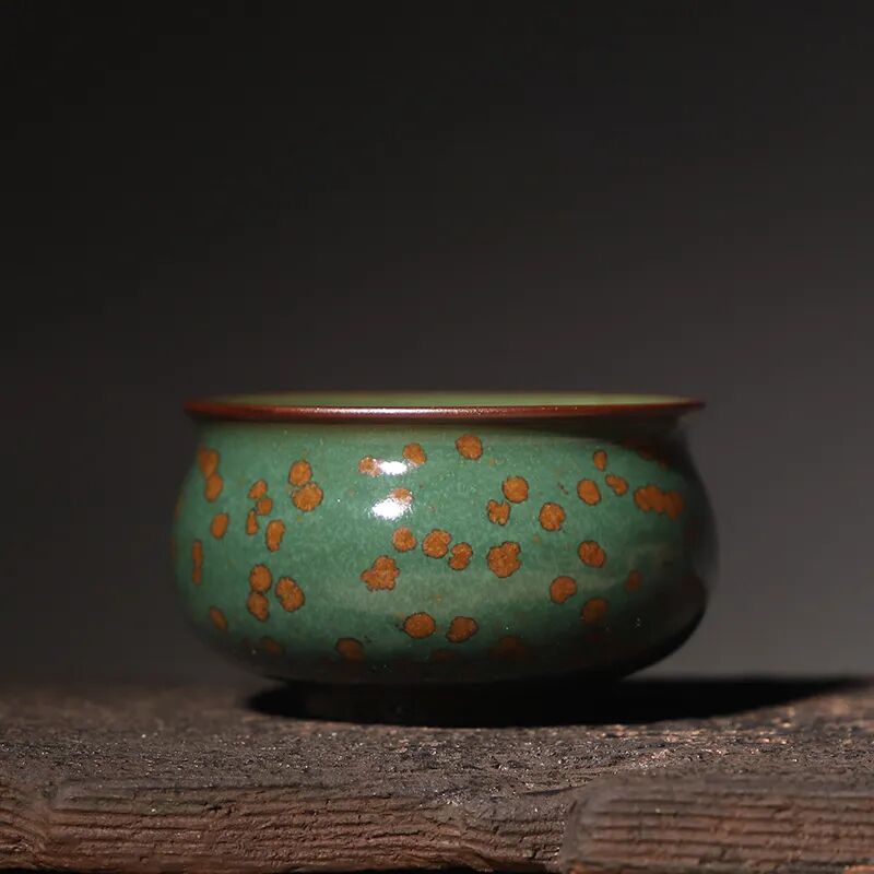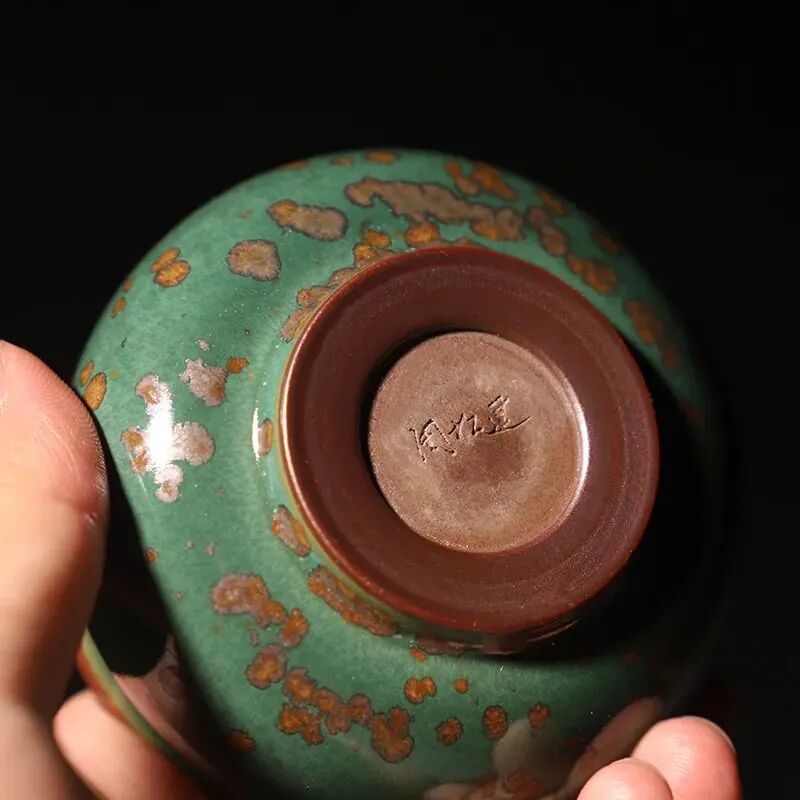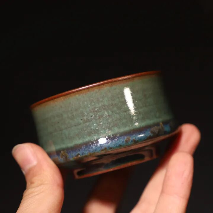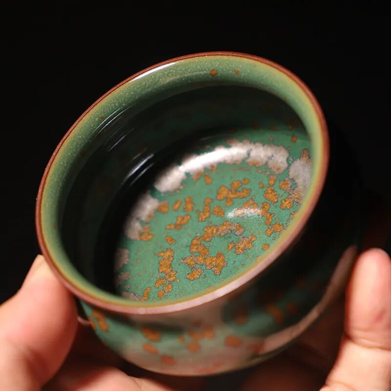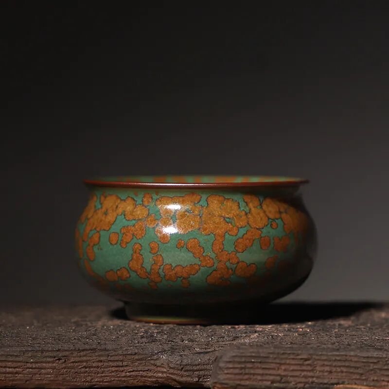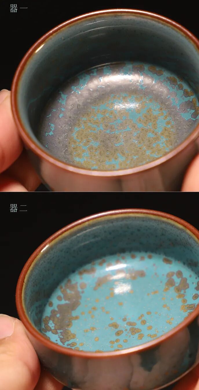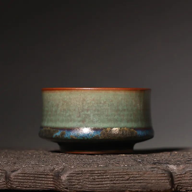 杯子整体呈现出孔雀绿的色调,仔细看这绿色又毫不单调,里面夹杂着深沉的熟褐色,冷静的雾霭蓝,神秘的茄色紫,古朴的葱翠青。