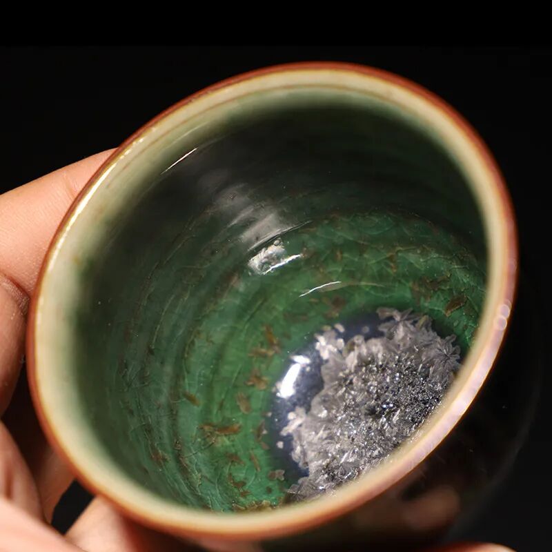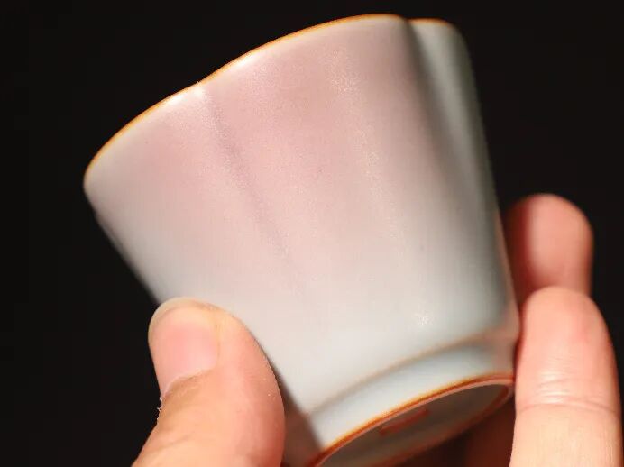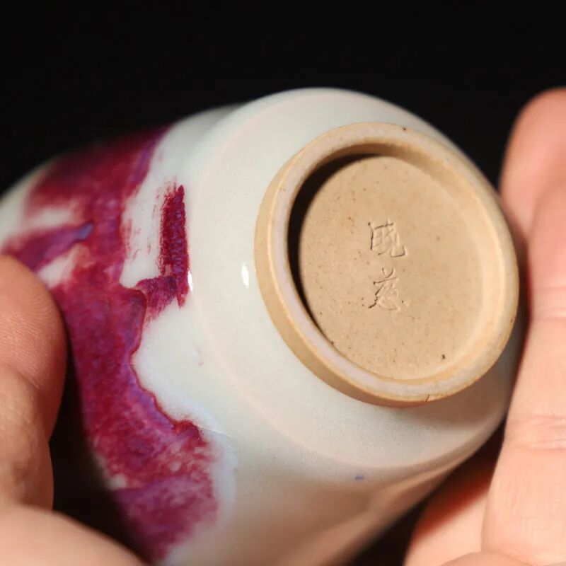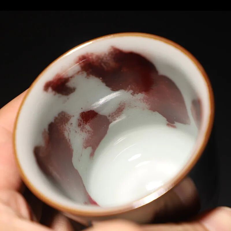 这枚红霞闻香杯由由周晓慈(周松建之子)全手工亲制,因为窑变全凭运气,每只杯子的花型都各有不同。