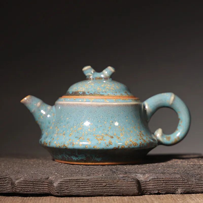 壶身整体呈淡蓝色,色泽温润如玉,令人忍不住想要触摸。