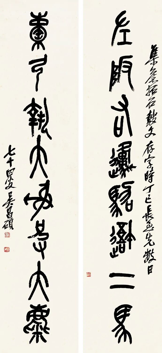 款识:集旧拓石鼓文存字,时丁巳长至先数日。七十四叟吴昌硕。