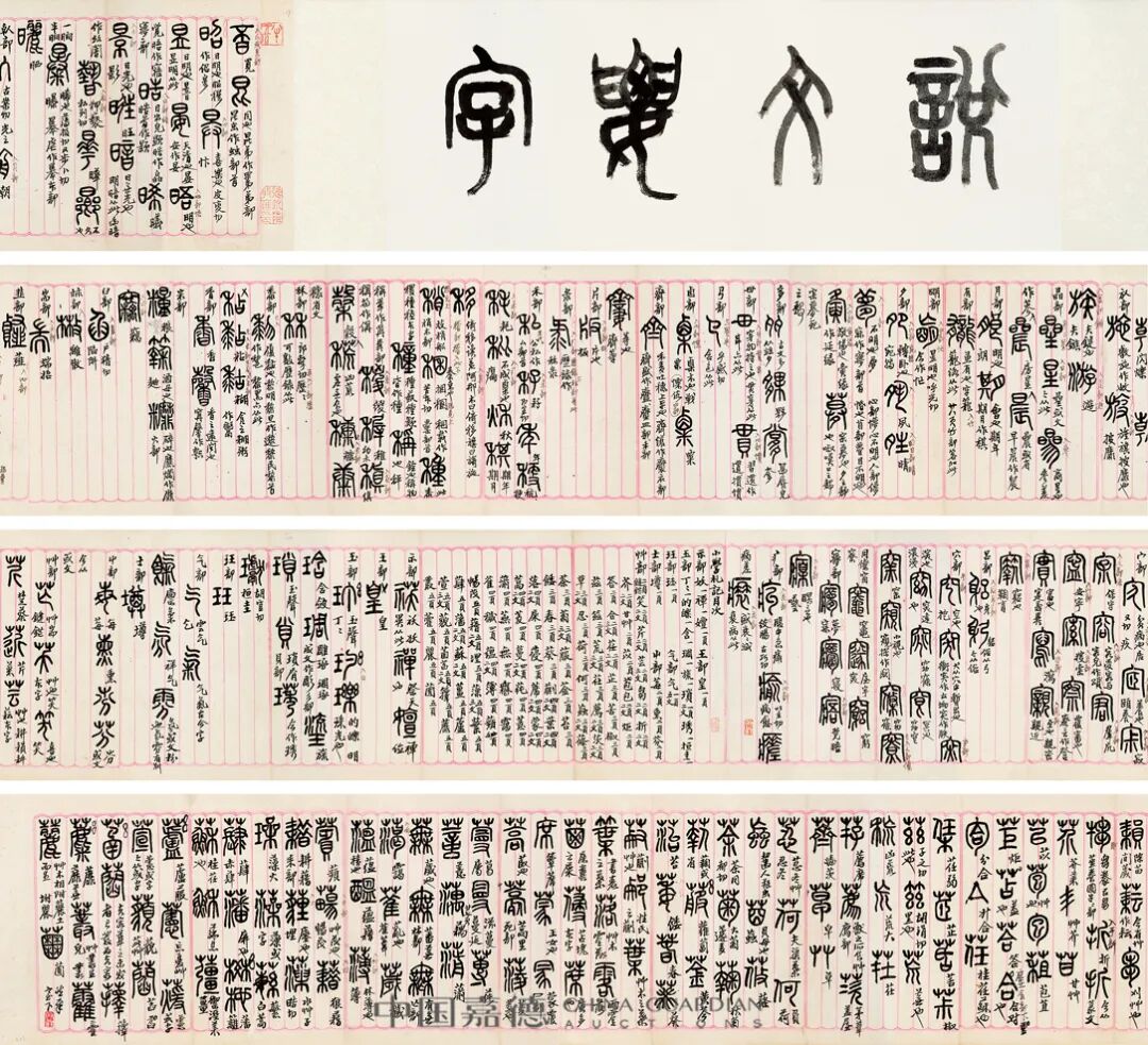 而《说文要字》手卷乃是来楚生《说文要字》一书之手稿。《说文要字》乃来楚生应潘天寿之请所整理编辑的在异体、通假方面的标准字书。此手稿记录了常用字和异体、通假字的书写方法,并加以标注,体例采用许慎《说文解字》按部首编排之法,以篆、行二体书写。来楚生以一己之力,耗费十一年成此巨著,考订之详,所费心血溢于楮上。惜其早逝,未能全部整理完毕,本卷则完整保留其两次批改笔迹,卷首尾都钤有其自用印鉴,是了解来楚生文字学研究成果的重要资料。