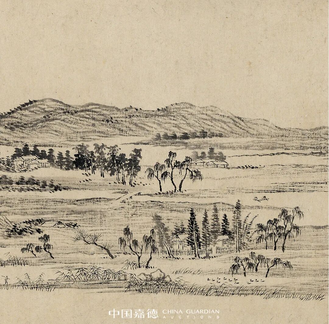 《水村图》,赵孟頫为其友人“水村居士”,诗人钱仲鼎所作。“坡角小柳三株,羌菁映带,一坡欲断,一堤复接。溪湖荡漾,山峰平远,势甚飘逸。”(吴升《大观录》),一派静净闲适的桃源景色,寄托了画家对淡泊宁静、自由安逸的生活状态的憧憬。大德六年,赵孟頫48岁,绘画风格已臻成熟,董其昌称“此卷为子昂得意笔,在《鹊华图》之上,以其萧散荒率,脱尽董、巨窠臼,直接右丞,故为难耳。”推重若是。或正因此,后世大家多有临仿或追摹其画境、画意之作。如前文恽王山水合册中恽寿平1686年客昆山所作小幅、1689年李含渼为魏坤作《水村图》(魏氏亦号“水村”),同时30余文坛名家题咏。本场第302号《四贤山水合卷》首帧杨文骢1638年为友人杨补作于金山舟中之《水村图》,更因为“五星聚首”之佳构而成为画史名篇。