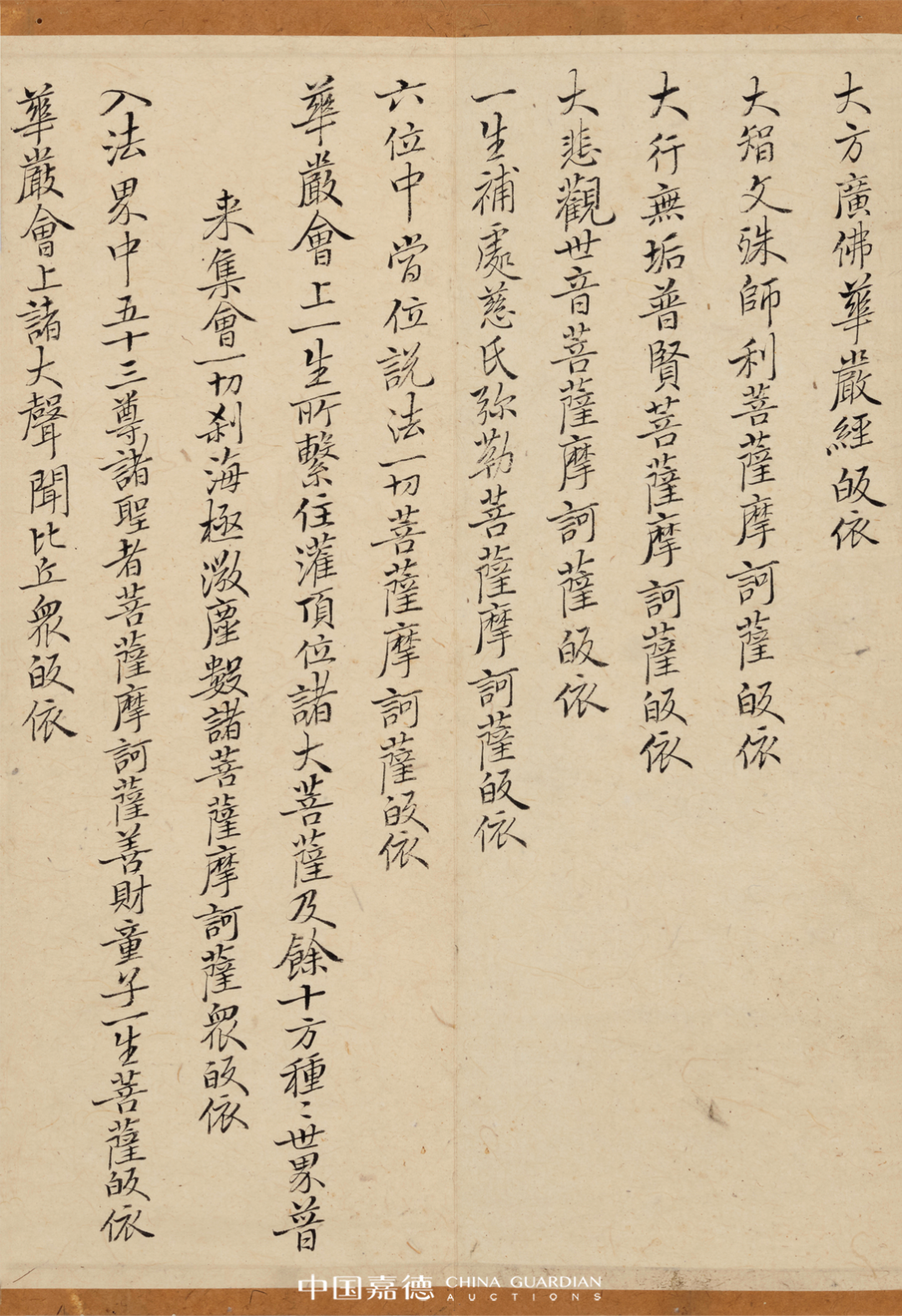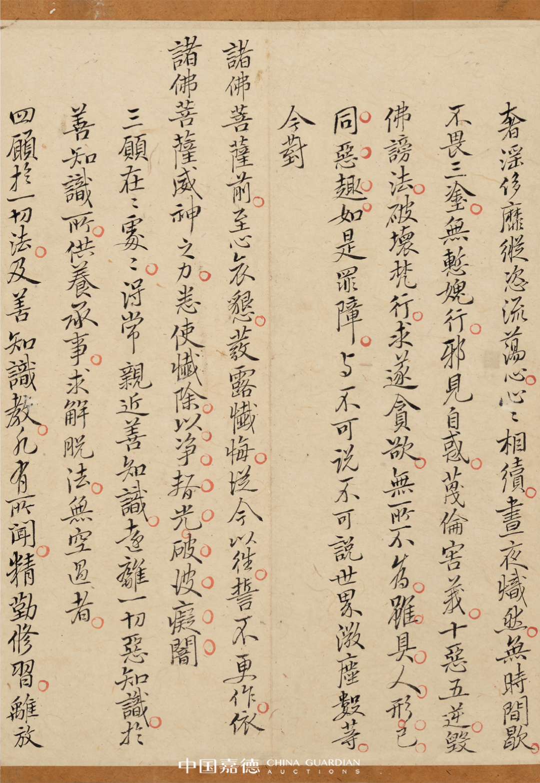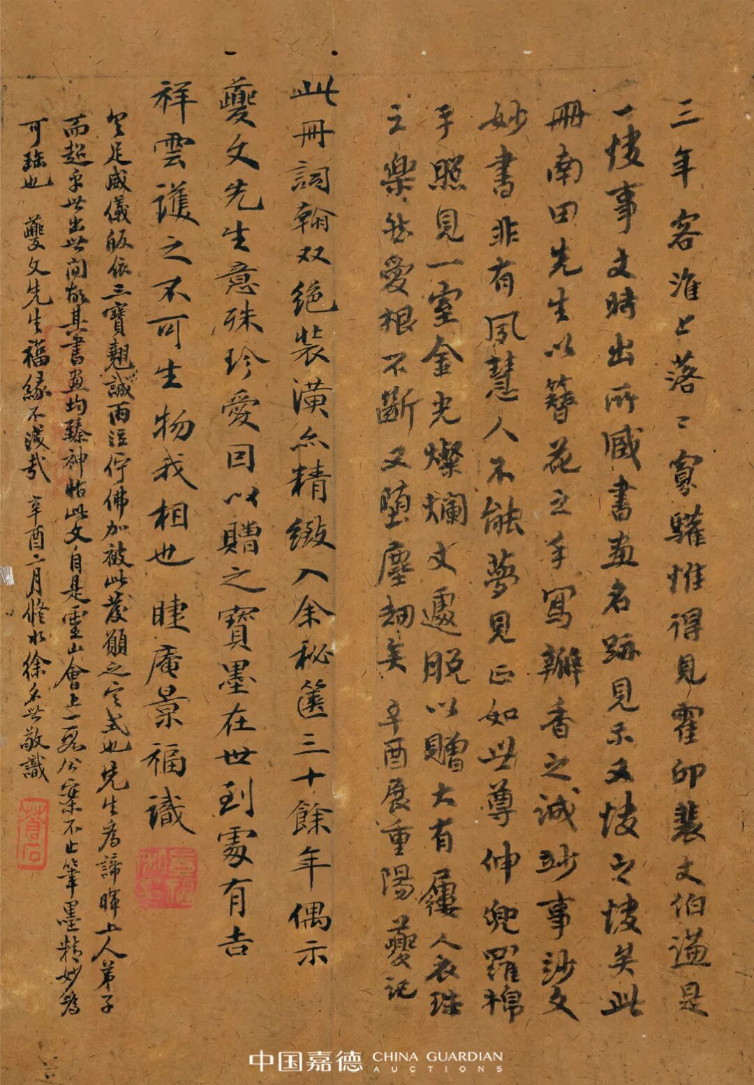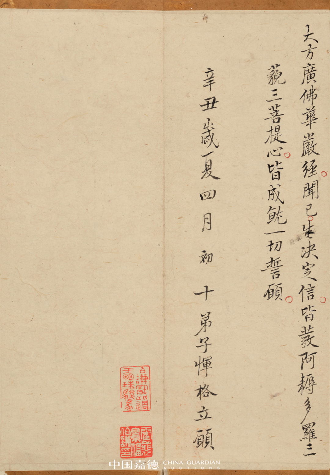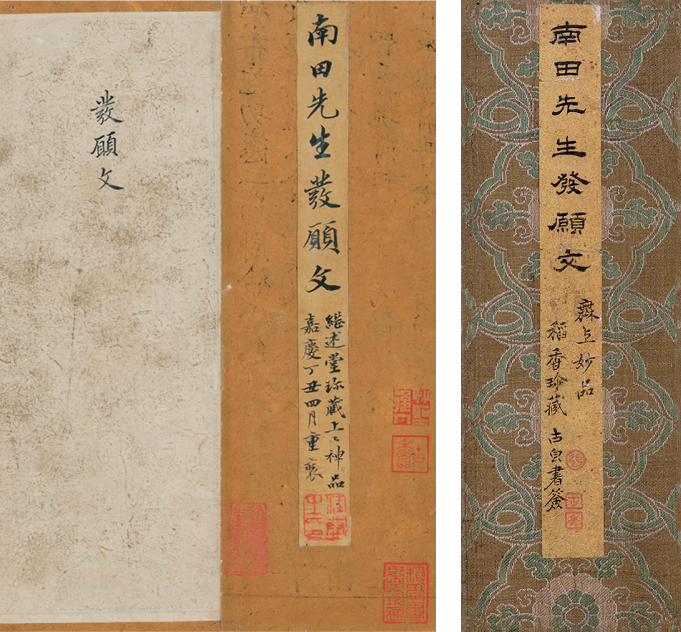 签条:1. 汪恭(清乾隆-嘉庆间,18-19世纪)南田先生发愿文。继述堂珍藏,上上神品。嘉庆丁丑(1817年)四月重装。钤印:汪恭之印