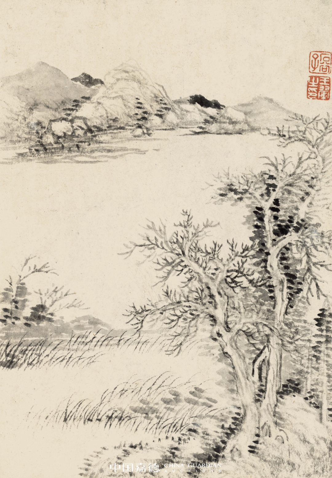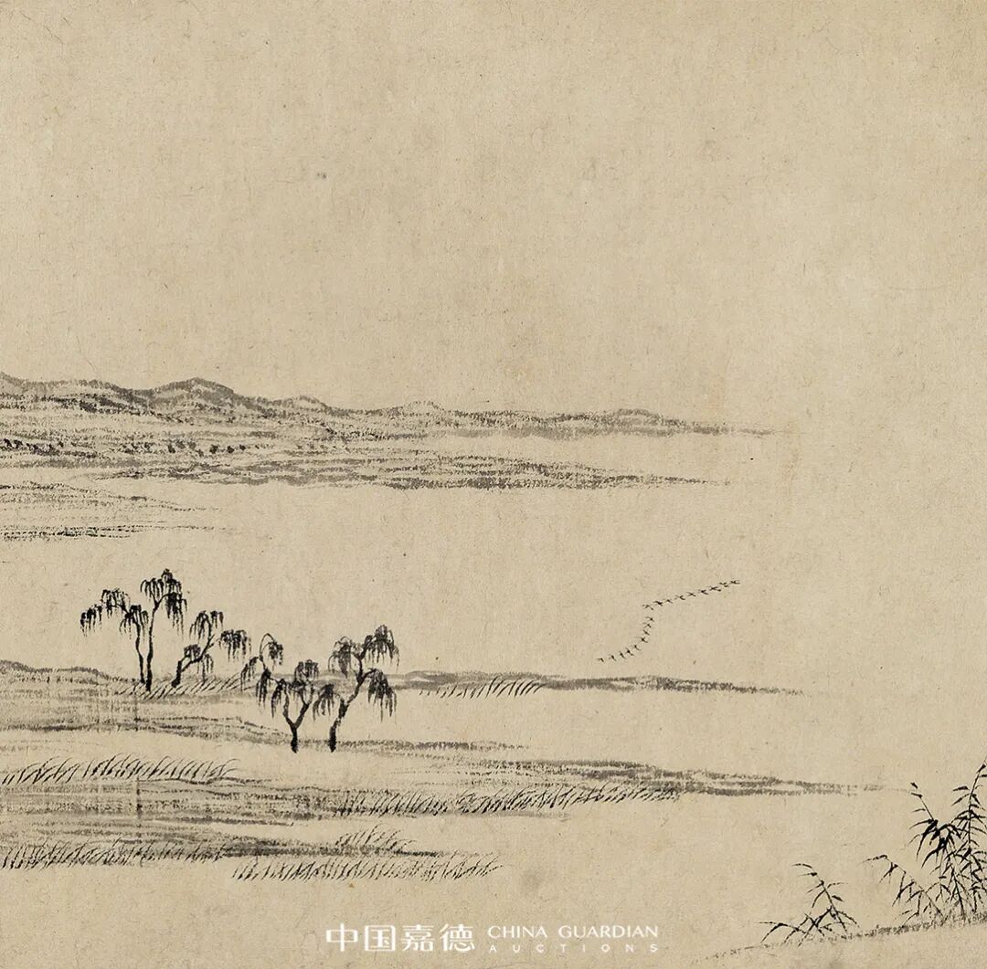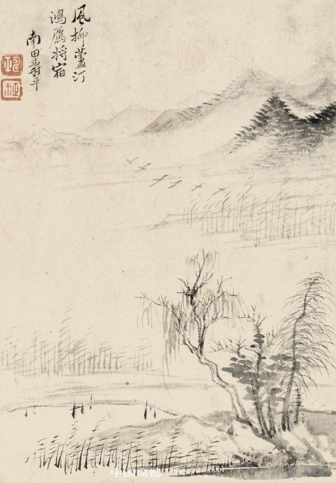另一幅《芦汀雁归》亦是南田所作,也是受眼前秋色的感化吧,此图画得简洁而率意,隔岸疏疏芦滩与淡淡几点飞雁,以及若隐若现的远山,写得尤为生动,意趣在笔墨之间,更在笔墨之外。