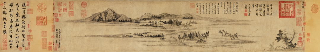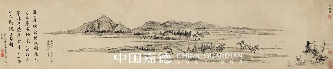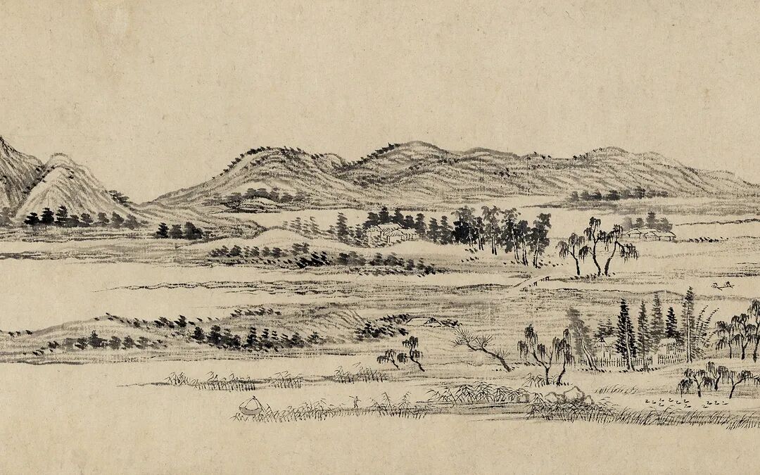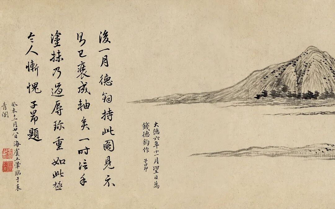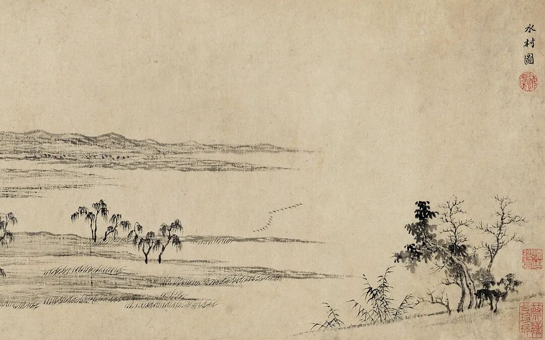 参考图:元赵孟頫《水村图》卷,现藏于故宫博物院(注:据《中国绘画全集》(七)图版说明,赵孟頫再题“后一月,德钧持此图见禾……”书于卷后另纸。)