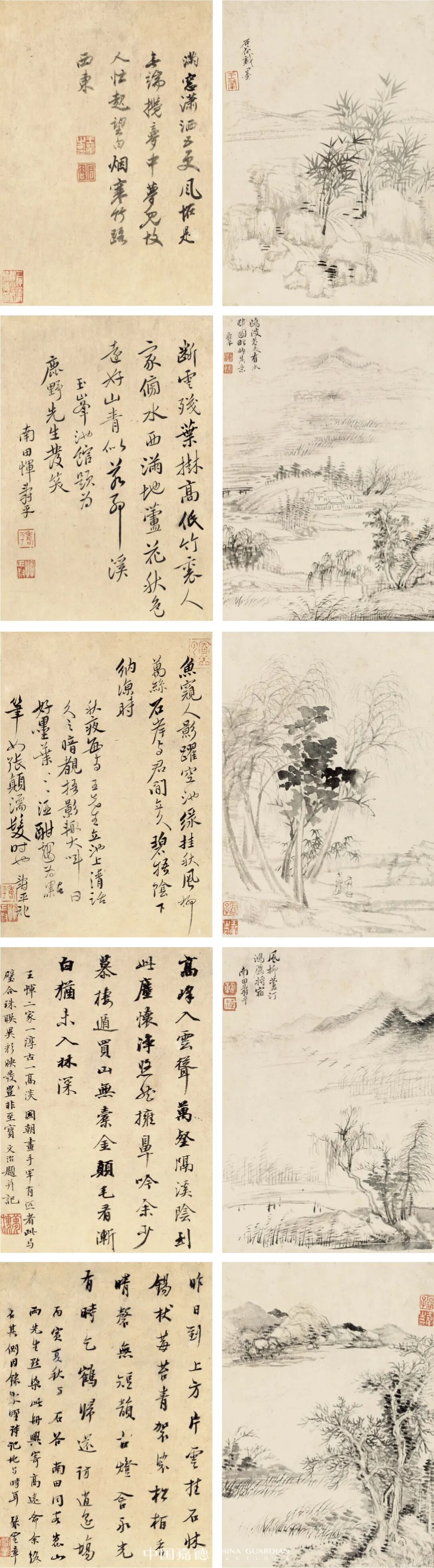 此套王翚、恽寿平《书画合璧册》,作于昆山徐乾学池馆,夜深于水边望月,犹以中国画笔墨观照池上景物,归寓后“酒酣戏为点墨,如张颠濡发时也。”以艺事相砥砺,兴之所至,必有佳作出诸纸上与笔端。今藏故宫博物院王画恽题的《晚梧秋影图》、《玉峰看月图》及本册就是当时趁兴挥洒写景寄情的笔墨留痕。