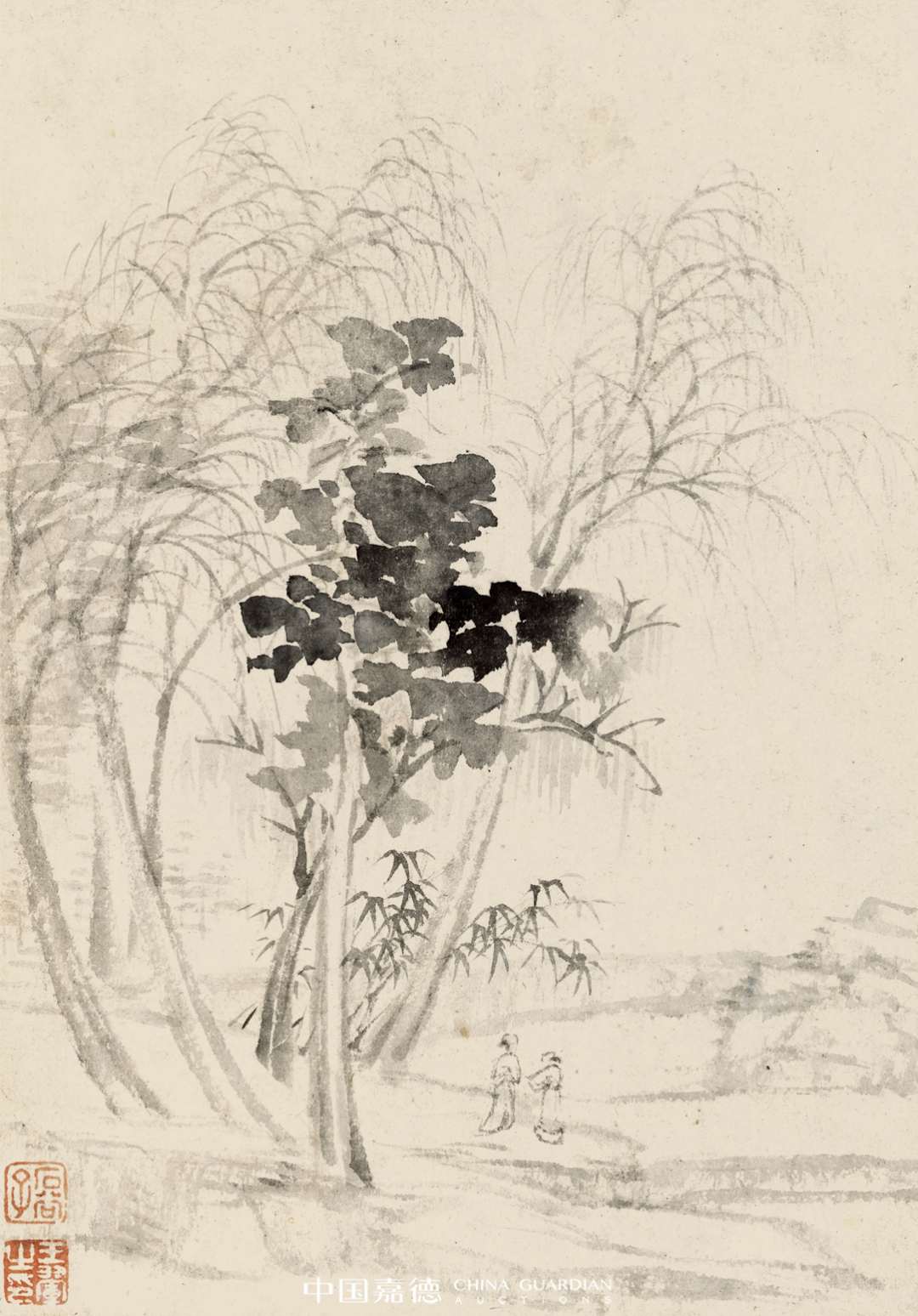 再一幅写高梧疏柳,二老在修竹坡岸上闲话,一人举手抬头,若有所悟,有不可或抑的动势,自然这又是石谷子大呼好墨叶的瞬间写照。与飘扬的柳条同观,在疏秀空灵的夜色中多了几分动感。淡宕清逸的情致,与恽南田的山水画真有几分相似——王石谷与恽南田相处,或多或少会被他俊朗超逸的情致所感化!