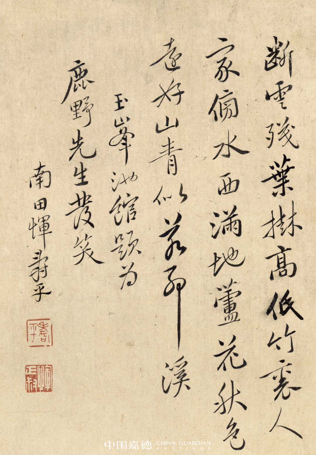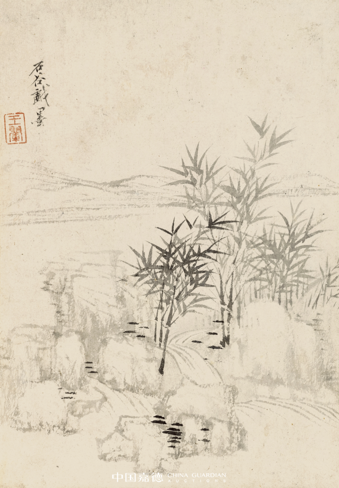 此册恽南田有二开,一以散笔略仿赵松雪《水村图》,潇洒悠远,笔法灵秀,一如他的书法,超脱的意致,已在赵子昂之外自成一格了。图左行书自作诗一首,书法遒美,灵秀中有圆厚之趣,是他成熟期典型的书风。南田每嫌石谷的书法与题识文字,多次直言规劝其多读书多练字,以免题损画面。惜石谷疲于应酬,画外功夫终欠一筹,故每为挚友所叹惋。