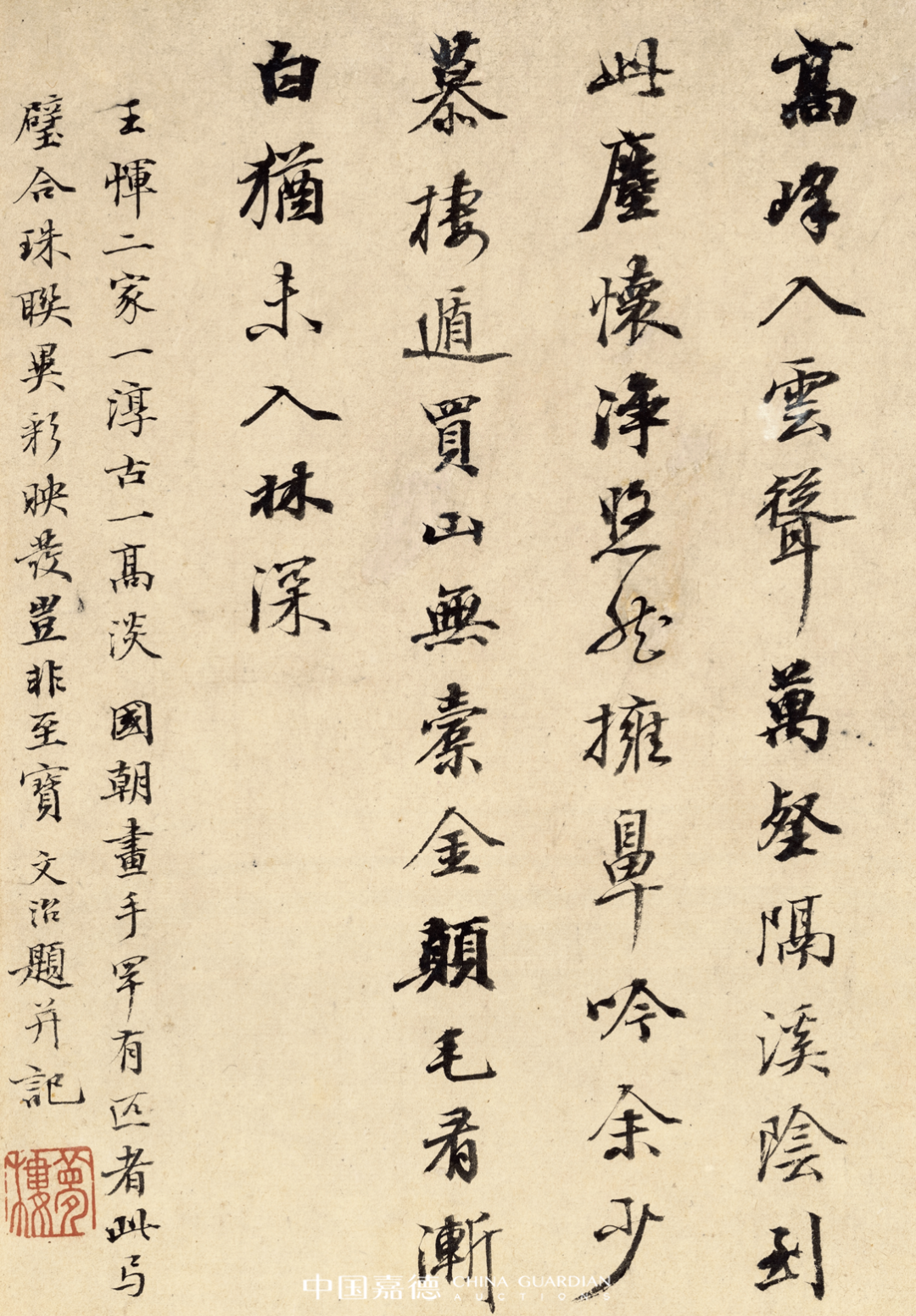 对页王文治(1730-1802)题:高峰入云耸,万壑隔溪阴。到此尘怀净,悠然拥鼻吟。余少慕栖遁,买山无橐金。颠毛看渐白,犹未入林深。王恽二家一淳古一高淡,国朝画手罕有匹者。此卷璧合珠联,异彩映发,岂非至宝。文治题并记。钤印:梦楼(参见上书《王文治》第9印,17页)