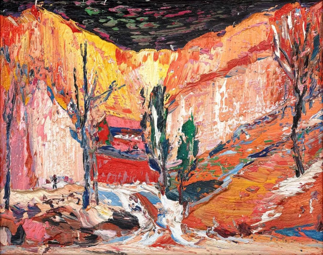 2015年创作的《秋山红岩》完美表现了尹朝阳擅长在巨幅中彰显笔触的快感,“操笔如在深山”,以极大张力表现峰峦浑厚势状雄强气象。天地间鼓荡真气,腾腾欲动,所谓气正迹高,气势相生, “ 洁净空阔的世界”中自然流露出抽象之理。这理并非宋人“理学”之理,亦非诗意之理趣,它更接近老庄之玄思。“辟天地玄黄之色,泄阴阳造化之机”(张怀《山水纯全集》后序),体现了创作者画学思想的自觉。苍崖白石,古木槎枒,红树跳宕,纵横捭阖,直探幽潜。如同宋人山水开始淡去浓艳缛丽而走向水墨渲淡的冷逸,尹朝阳的画笔如同山涧凛冽的寒风,荡尽繁缛,以极其简劲的话语表现出自然野性。如果说尹朝阳的“ 风景” 是“ 色彩主义” 的极致, 毋宁说是对中国绘画写意精神的深刻揭示,雄浑壮丽如中古之象;迹简意远直追汉魏六朝,向外的视觉扩张,向内的美学体验,或许可以认为将宋人山水中具有的古典主义经验引向一个新的境界,具有一种强烈的当代性,同样,它亦超拔当代艺术全面交付“观念”的无奈,果断地秀出肌腱,彰显其生命的创造力。