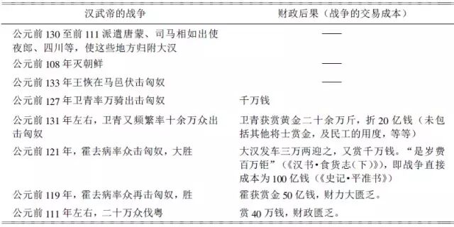 按照学者邓宏图的考证,武帝时期平均一年的国家财政盈余为40亿钱,再加上皇室财政盈余43亿,一共约83亿钱。然而只要出征获胜,武帝给卫青和霍去病的封赏动辄数十亿钱,就会超过国家财政盈余,这还不算其他将士的奖赏以及征集民夫的费用等等。再加上几次天灾后的赈灾费用,即使武帝将自己的皇室盈余全部投入,也未必能弥补财政亏空。