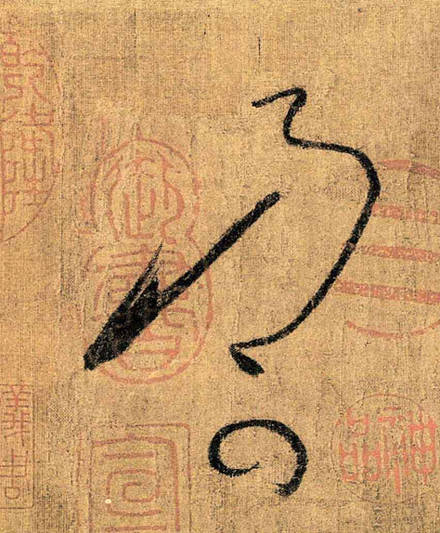 《苦笋帖》前有清代乾隆皇帝题签和引首,帖后有历代收藏题跋,并有宋、明、清历代收藏家鉴赏印数十方。为《书画记》、《平生壮观》等著录。这件"苦笋帖"是唐代草书大家怀素的传世亲笔墨迹之一。文字不多,总共才14字,不仅能使我们观赏到那娴熟的笔法和行云施雨、走蛇舞龙般的线条之美,同时还能直接感受到作者书写时的内在气质。![]()