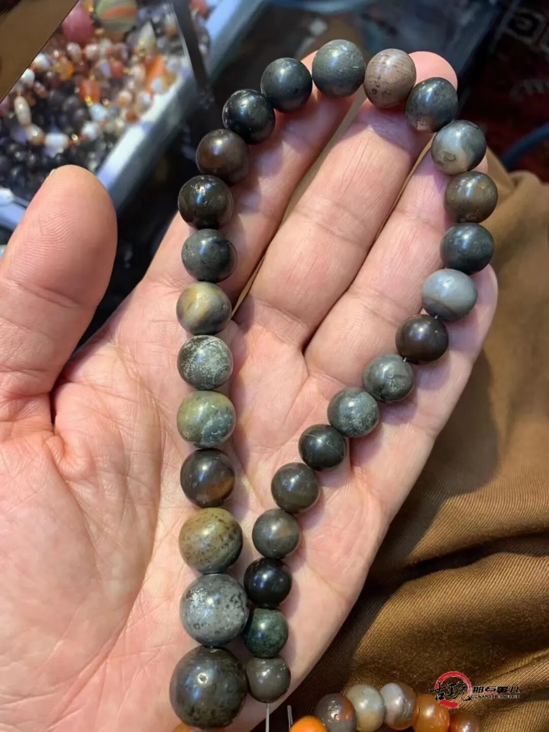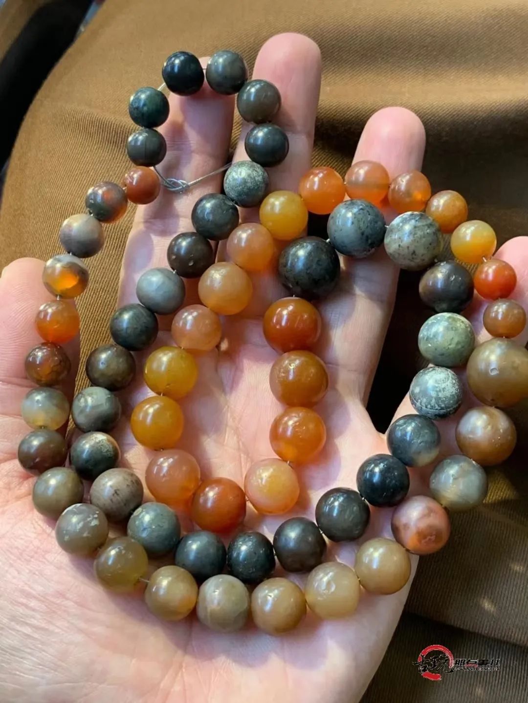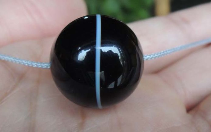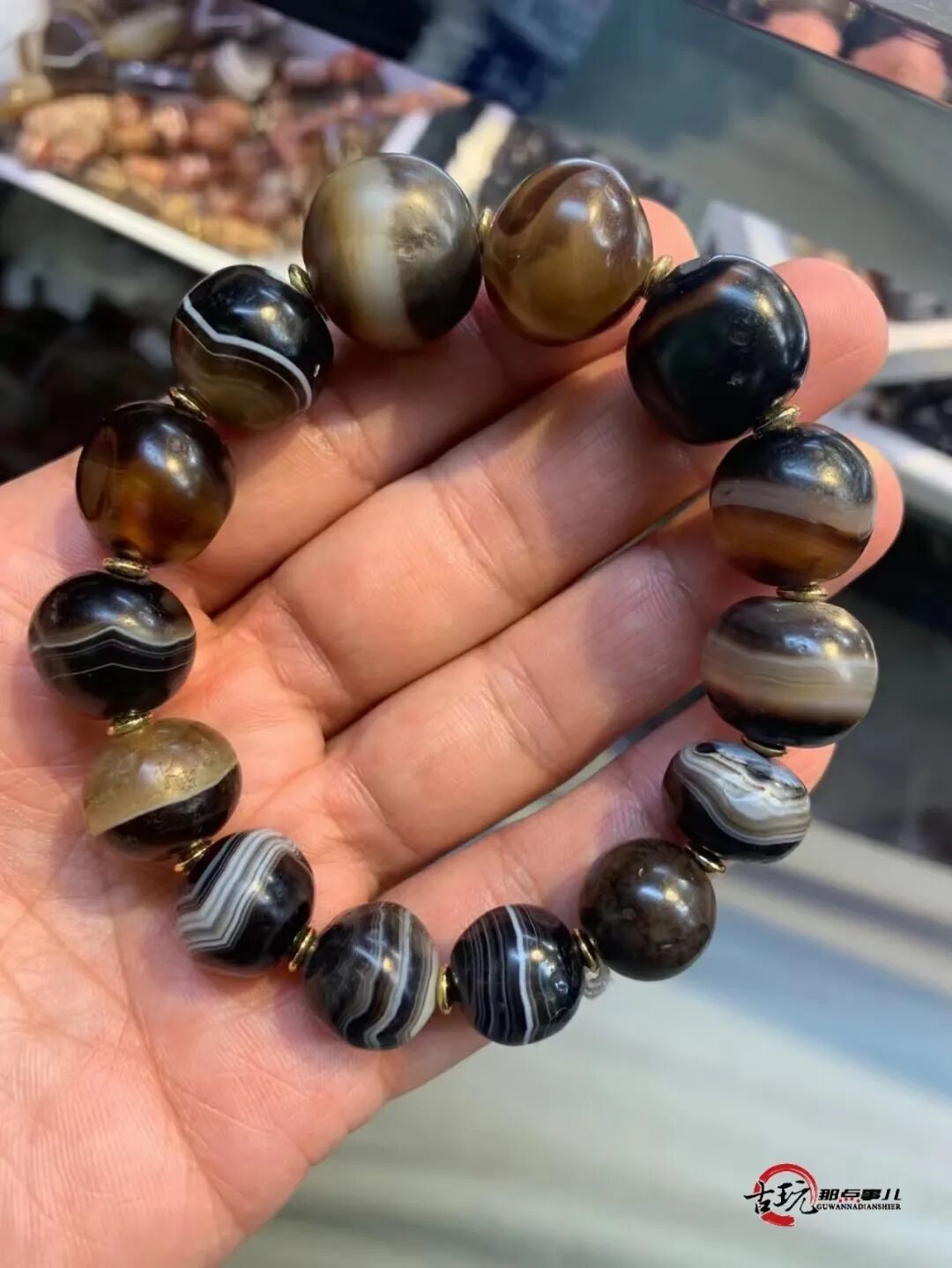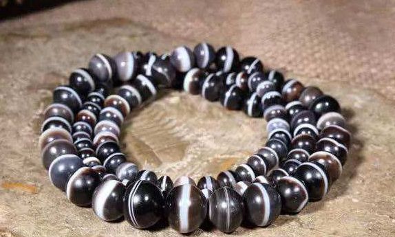 造型颜色多种多样,有圆珠、老型桶珠、宽线珠、细线珠、糖色珠、红色珠、蓝沁色珠、单线珠、多线珠,俏雕件等等。品相上讲究,黑白分明、白线部分中、正、平、直,白线干净无杂质,至于宽线、细线的问题因人而异了,珠形也是看个人喜好了。一线药师珠子的矿石,其实就是缠丝玛瑙,从中选取带线的部分切出来做珠子。这张一线药师矿石的图片,就可以很有力的解释单线、多线、宽线、细线的问题了。但无法解释颜色的问题,因为上面的矿石看起来是灰黑色的,为什么成品珠子大多都是黑色的呢?烧色工艺(具体怎么烧色的不是很清楚,据目前已知的情况是加热),使灰色的部分颜色加深成黑色,中间的玛瑙缟丝颜色不变。上面这张标本照片,只代表一个产地的特征(巴西),另外还有乌拉圭和马达加斯加产区,颜色上可能会深一些,但是不会跟成品珠一样黑。因为更多的玩家是不懂的,解释半天也听不懂,还不如不解释,因为市场上所有的黑色药师珠都是这样的。比如糖色、红色、黄色,具体的优化方式不太清楚,或许有这种颜色的原料吧?或者更简单的说,如果有缠丝玛瑙,不论什么颜色都可以做出一线药师来。至于蓝沁,可能也是跟选料有关系的,可以理解为一种有特色的一线药师珠。其实这种仿品很低端,比较容易看出来的,白色部分仅仅浮在表面,有的甚至可以抠下来,画线的部分有接头,并且从道孔里观察不到白色的缟丝(白色缟丝应该是从里到外的,看过矿石的朋友就能明白)。