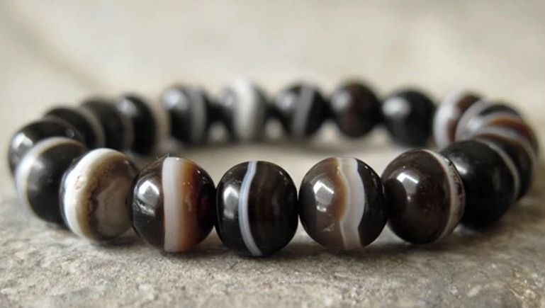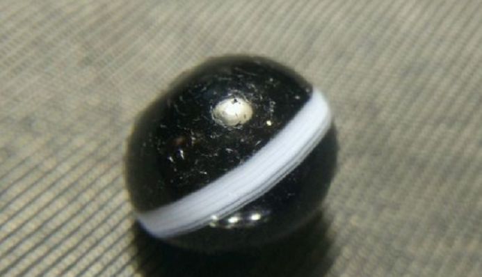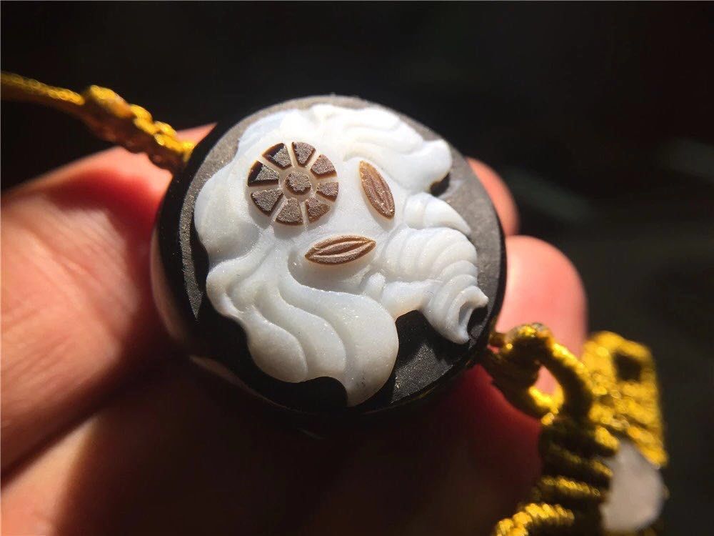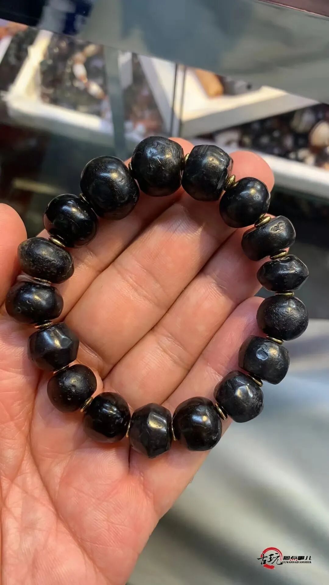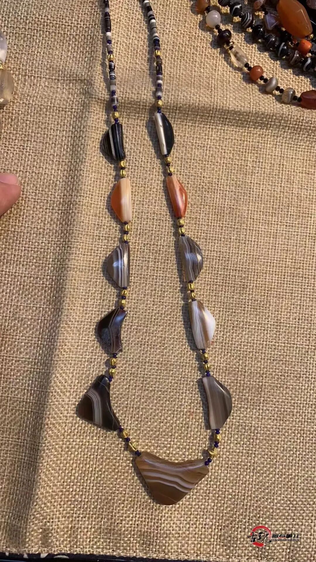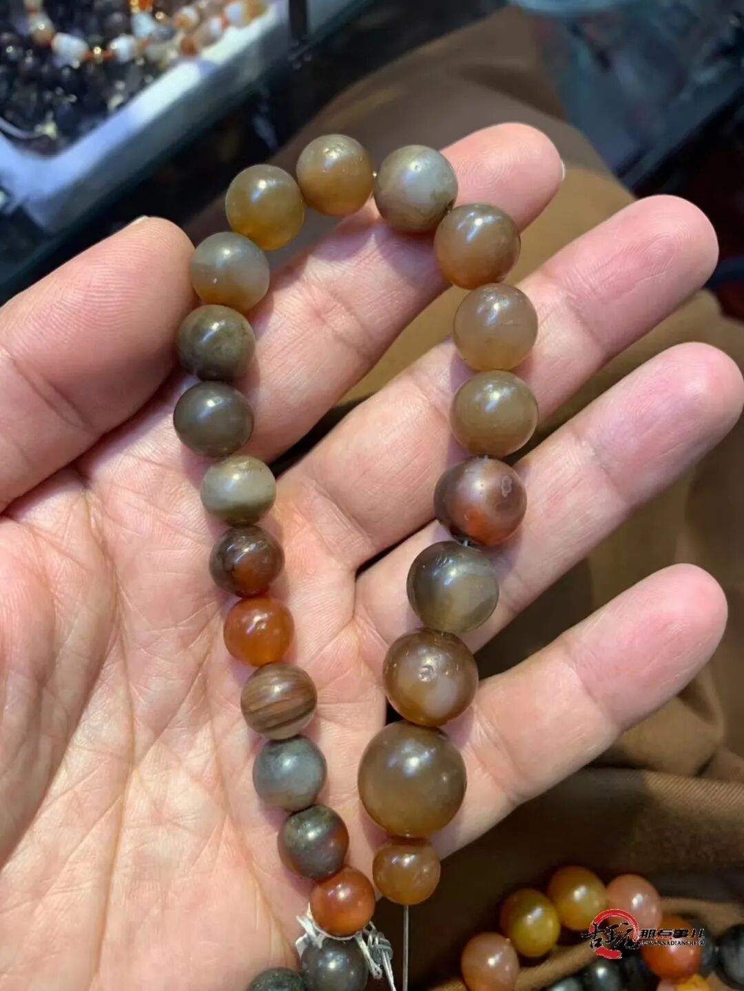 造型颜色多种多样,有圆珠、老型桶珠、宽线珠、细线珠、糖色珠、红色珠、蓝沁色珠、单线珠、多线珠,俏雕件等等。品相上讲究,黑白分明、白线部分中、正、平、直,白线干净无杂质,至于宽线、细线的问题因人而异了,珠形也是看个人喜好了。一线药师珠子的矿石,其实就是缠丝玛瑙,从中选取带线的部分切出来做珠子。这张一线药师矿石的图片,就可以很有力的解释单线、多线、宽线、细线的问题了。但无法解释颜色的问题,因为上面的矿石看起来是灰黑色的,为什么成品珠子大多都是黑色的呢?烧色工艺(具体怎么烧色的不是很清楚,据目前已知的情况是加热),使灰色的部分颜色加深成黑色,中间的玛瑙缟丝颜色不变。上面这张标本照片,只代表一个产地的特征(巴西),另外还有乌拉圭和马达加斯加产区,颜色上可能会深一些,但是不会跟成品珠一样黑。因为更多的玩家是不懂的,解释半天也听不懂,还不如不解释,因为市场上所有的黑色药师珠都是这样的。比如糖色、红色、黄色,具体的优化方式不太清楚,或许有这种颜色的原料吧?或者更简单的说,如果有缠丝玛瑙,不论什么颜色都可以做出一线药师来。至于蓝沁,可能也是跟选料有关系的,可以理解为一种有特色的一线药师珠。其实这种仿品很低端,比较容易看出来的,白色部分仅仅浮在表面,有的甚至可以抠下来,画线的部分有接头,并且从道孔里观察不到白色的缟丝(白色缟丝应该是从里到外的,看过矿石的朋友就能明白)。