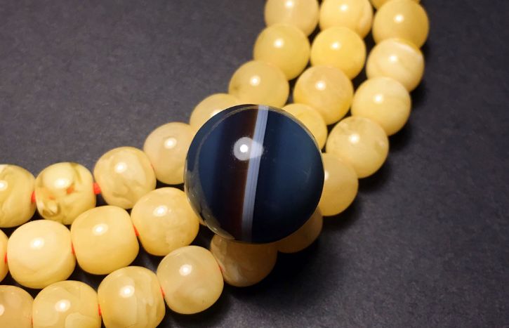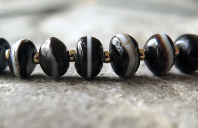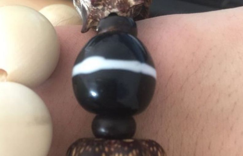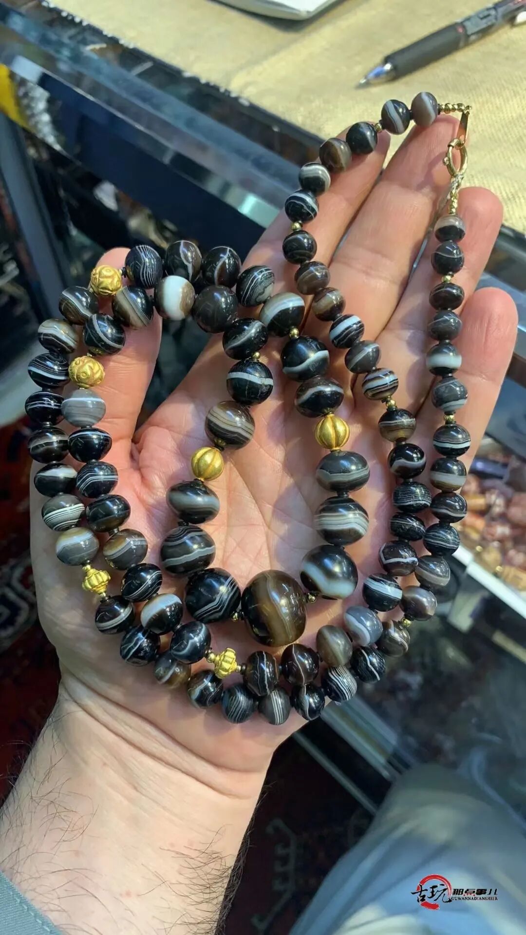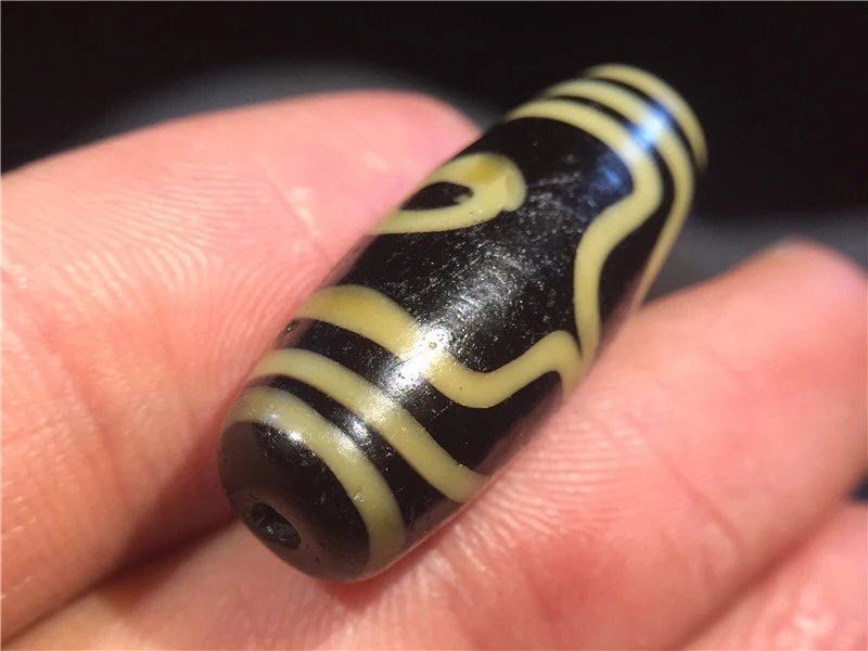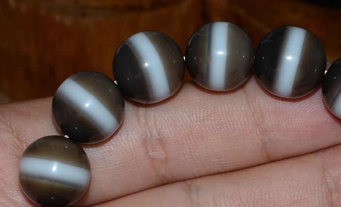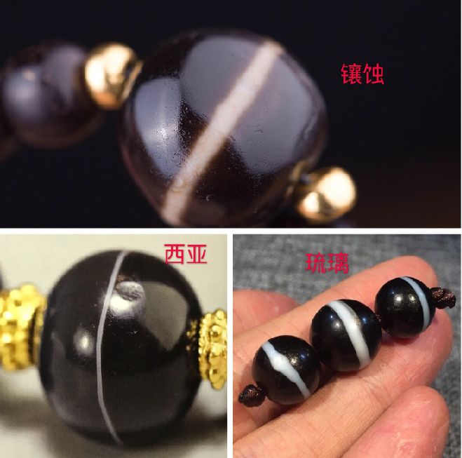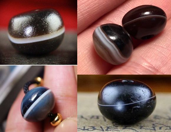 新药师珠很容易理解,老药师珠要想说清楚就比较难了。可以分为镶蚀一线药师、西亚(藏系)一线药师、琉璃药师珠。前两种药师珠,材质上基本相同,都属于玛瑙类,但是制作方法有非常大的不同。老镶蚀药师珠的制作方法类同于天珠的制作方法,先通体白化,然后再染上黑色,留出中间一道白线,镶蚀的珠子也是最贵的药师珠了。老西亚药师珠白线部分是天然白线(也有老缠丝玛瑙),与前文新药师珠的白线一样。藏系的老一线药师珠比西亚的更油润一些,佩戴方式不同造成的。至于,老一线药师珠是否经过优化(即优化变黑),或许古今的矿料采集渠道不同?则不得而知了。老一线药师珠,从颜色上有的黑白分明,有的则颜色浅一些,如图所示。老琉璃药师珠是用琉璃材质仿一线药师,属于老仿了,中国的琉璃工艺自古就有(早到西周的费昂斯琉璃珠)。这些琉璃做的药师珠,经过长期的佩戴,也会形成包浆皮壳,琉璃仿天珠、仿药师珠都有存量,常见的是清代的琉璃天珠和药师珠。