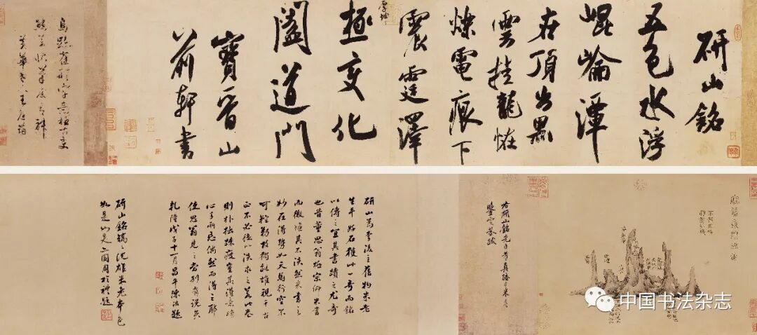 因之我们得以知道米芾《自叙》所谓“遂并看法帖,入魏晋平淡”,乃是听从了东坡忠告的易辙之举。这在元章的翰墨生涯中可谓是关键性的一著。我们只须看看他早期的《三吴诗帖》和《邂逅帖》,其中欧氏紧结寒俭的遗风还是占着主导地位,即使在他书于长沙的《砂步二诗》《道林》《法华台》(后二帖《三希堂石渠宝笈》误归于金王庭筠名下)等帖中,还基本未脱晚唐沈传师、段季展习尚的窠穴。然而在作于元丰癸亥(六年)(一〇八三)的《杭州龙井山方圆庵记》中,已明显地带有《圣教序》的雅调逸韵,气格上无可辩驳地得到了一次升华,这其实相距接受东坡规劝才一年时间!我想,老米对东坡始终如一的忠诚,尽管还有对以后仕途上提携的感恩在内,但在很大程度上当是出于这一点拨的报答。